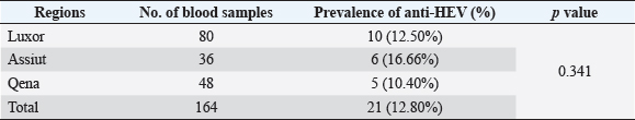 Fig. 1. Prevalence of serum anti-HEV among rabbits in different regions in Egypt. Table 3. Prevalence of HEV RNA in fecal samples among rabbits at different regions in Egypt.