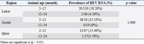 Fig. 2. Prevalence of HEV RNA in fecal samples among rabbits at different regions in Egypt. Table 4. Age-related frequency of HEV infection at different Egypt governorates among rabbits population.