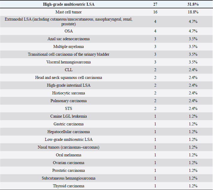 Cats were mostly domestic shorthair (n=14, 87.5%), followed by Ragdoll and Siamese (one each, 6.25%); median age was 12 years (range=6–15 years), eight cats were neutered females and eight neutered males. Tumor typesTwenty-seven tumor types were diagnosed (Tables 2 and 3). High-grade multicentric LSA was the most common in dogs (n=27, 31.8%), followed by cutaneous and subcutaneous MCT (n=16, 18.8%). Gastrointestinal LSA was the most common in cats (n=4, 25%), followed by cutaneous MCT (n=3, 18.7%). Chemotherapy protocolsWhen used as a single agent, chemotherapy included the following drugs: vinblastine (17), carboplatin (15), mitoxantrone (6), chlorambucil (5), lomustine (5), melphalan (5), vinorelbine (2), doxorubicin (1), and gemcitabine (1.) Multidrug protocols were as follows: CHOP (26), COP (7), LOPP (4), VAC (2), DMAC (1), COAP (1), carboplatin/doxorubicin (1), carboplatin/5-fluorouracil (1), and vinblastine/lomustine (1). Adverse eventsOf 101 patients, 51 (50.5%) did not show any AEs, while 50 animals (49.5%) showed at least one AEs. Twenty-three (39%) patients experienced gastrointestinal AEs (56% Grade 1, 39% Grade 2, and 5% Grade 4); 29 (49%) developed hematological toxicity, including 22 (76%) neutropenic events (41% Grade 1, 32% Grade 2, 18% Grade 3, and 9% Grade 4), 7 (24%) thrombocytopenic events (14% Grade 1, 44% Grade 2, 14% Grade 3, 14% Grade 4, and14% Grade 5); 2 dogs (3%) developed hepatotoxicity (Grade 2), 1 dog (2%) had cardiotoxicity (Grade 2), and 4 dogs (7%) developed lethargy (Grade 2). Table 3. Tumor types in cats.