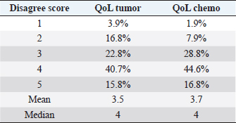 Eight patients experienced multiple side effects: five (10%) had both hematological and gastrointestinal AEs, one (2%) had gastrointestinal AEs and lethargy, one (2%) had hematological AEs and lethargy, and one (2%) had both gastrointestinal and hematological AEs and lethargy. When looking for adverse effects at any possible association between QoL and chemotherapy protocol (question: “Did the QoL of my pet drastically worsen after the chemotherapy protocol?”), analysis of the data showed no statistically significant difference between the two groups (single-agent vs. multidrug protocol, p=0.189). Questionnaire answersRegarding the QoL score measurement, 16 owners (15.8%) stated that they strongly disagreed about a decrease in QoL of their pet following diagnosis, 41 (40.7%) expressed disagreement, 23 (22.8%) were neutral, 17 (16.8%) agreed, and only 4 (3.9%) strongly agreed. Regarding a possible association between QoL and tumor diagnosis (question: Did the QoL of my pet drastically worsen after the diagnosis?), data analysis showed that there was no statistically significant difference between the two groups (single-agent vs. multidrug protocol, p=0.462). Seventeen owners (16.8%) stated that they strongly disagreed about a decrease in QoL due to chemotherapy treatment, 45 (44.6%) disagreed, 29 (28.8%) were neutral, 8 (7.9%) agreed, and only 2 (1.9%) strongly agreed (Table 4). Table 4. Questionnaire answers.
