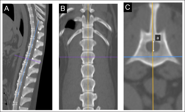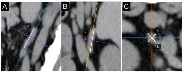 Fig. 1. Method used for measuring minor axes of the bilateral adrenal glands. In the sagittal (A) and dorsal (B) sections, the crosshairs were positioned to be parallel to the maximum diameter of the left adrenal gland (a). The crosshairs show the slice position in the other two panels. The transverse section including the maximum diameter (a) is created. (C). The maximum diameter is defined as the major axis (b) parallel to the section plane, and the maximum diameter perpendicular to (b) is defined as the minor axis (c). Spinal cavity evaluation on CTIt has been reported that the right adrenal gland is situated near the T13–L1 vertebrae, while the left adrenal gland is located near the L2 vertebra (Evans, 2013). Therefore, the T13–L5 vertebral body was selected as a candidate for the normalized site of the reference value. The spinal cavity of T13–L5, which is close to the bilateral adrenal glands, was selected as a candidate for the reference site. The T13–L5 spinal cavity was measured on 3D-MPR from CT images using the bone algorithm (window level: 300, window width: 1,500). In the sagittal and dorsal planes, the crosshairs were adjusted so they were parallel to the spinal cord. In the sagittal sections, the plane passing through the center of the dorsal edge of each vertebral body was drawn in the transverse plane (Fig. 2A–C). The height of the spinal cavity visualized in the cross-plane was recorded (Fig. 2Ca). Examination of the reference site for creating standard valuesThe bilateral adrenal minor diameters (mm) and T13–L5 spinal cavity height (mm) were used to calculate the adrenal minor axis/measurement site ratios. Scatterplots of the calculated ratios and body weights showed approximate straight lines. To compare the variation of data, the standard deviation was divided by the average. The coefficient of variation was calculated. Initially, we used 40 randomly selected animals from the case group; subsequently, we gradually increased the number of animals and searched for measurement sites with a slope close to zero (approximate straight). Association between adrenal minor axis/L4 spinal cavity ratio and body weightThe adrenal minor axis (mm) was divided by the height of the L4 spinal cavity (mm) to calculate the adrenal minor axis/L4 spinal cavity ratio. Associations among the adrenal minor axis, L4 spinal cavity height, adrenal minor axis/L4 spinal cavity ratio, and body weight were investigated using a scatter diagram, and the corresponding correlation coefficient (r) values were calculated. The 95% range was determined by percentile, and the standard range of adrenal minor axis/L4 spinal cavity ratio was estimated.