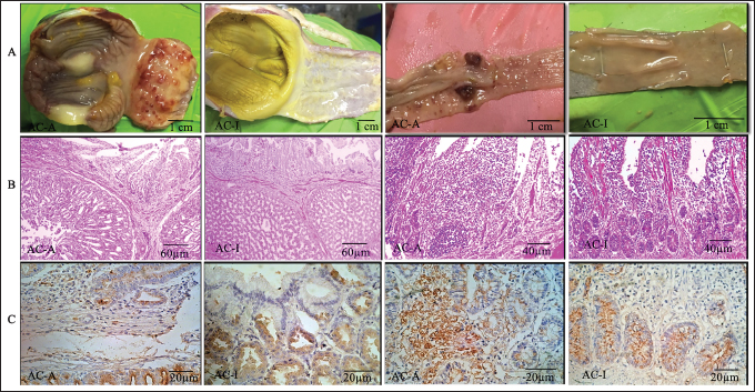 Fig. 1. Proventriculus and ceca tonsil on 5th-day pi. (A). Anatomical pathology; (B). Histopathology; (C). Immunohistochemistry; AC-A (Domestic chicken) and AC-I (Alabio ducks). Infected with isolate ducks/Aceh Besar_IND/2013/eoAC080721. Histopathology with hematoxylin and eosin. Immunohistochemical using anti-NDV antibody.