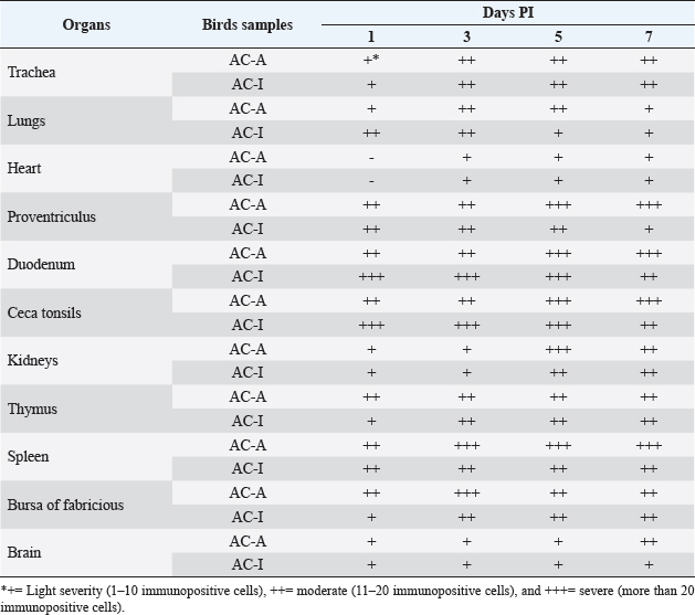 AbstractBackground: Newcastle disease is very pathogenic in chickens, whereas in ducks, the disease does not show any clinical symptoms. Aims: To compare the clinical symptoms features, pathological lesions, viral distribution, and apoptosis response caused by the Newcastle disease virus (NDV) in domestic chicken and Alabio duck. Methods: Forty domestic chickens and 40 Alabio ducks were separated into four groups: domestic chicken and Alabio duck treatment groups, where each was infected by NDV velogenic ducks/Aceh Besar_IND/2013/eoAC080721 in 106ELD50 dosage. The domestic chicken and Alabio duck control groups were each inoculated with Phosphate Buffer Saline. The infection route was intraorbital, 0.1 ml in volume. Symptoms were observed from day 1 until day 7 post-infection (PI). Necropsy was performed on days 1, 2, 3, 5, and 7 PI for organ collection. Results: Symptoms observed were disorders in the respiratory, gastrointestinal, and nervous systems, followed by 100% mortality in domestic chickens. In Alabio ducks, there were only depression and slight lethargy. The lesion in domestic chicken day 1 appeared by the lungs, thymus, Fabricius bursa, spleen, and kidney. On day 3 PI, lesions were also found in the heart, proventriculus, duodenum, and cecal tonsil. On days 5 and 7 PI, the trachea and brain lesions were found. In Alabio ducks, lesions were found in the lungs, thymus, spleen, and proventriculus on day 1. Afterward, on day 3, light lesions were found in the heart. On day 5, lesions were found in the trachea and brain; finally, on day 7, light lesions were only found in the thymus, spleen, and brain. Immunopositive reaction NDV in domestic chicken was highest in the proventriculus, duodenum, cecal tonsil, and lymphoreticular organs. In the Alabio duck, it was highest in the duodenum and cecal tonsil. The caspase-3 percentage in domestic chicken increased on day 3 PI; in Alabio ducks, on day 2 PI. Conclusion: Clinical symptoms and pathological lesions were faster and more severe in domestic chickens. The immunopositive reaction NDV in domestic chicken continued to increase, while in Alabio ducks, it decreased until the last observation day. Apoptosis percentage increased earlier in the Alabio duck than in domestic chicken. Keywords: Apoptosis, Caspase-3, Immunohistochemistry, Pathology, Newcastle disease. IntroductionNewcastle disease (ND) is highly pathogenic in reared chicken but less pathogenic in other birds that are important in spreading the Newcastle disease virus (NDV). It has high morbidity and mortality and can spread rapidly (OIE, 2021). NDV has widely infected bird species, such as chickens, ducks, geese, pigeons, parrots, and several other birds (Zhang et al., 2011). Ducks and geese act as a natural reservoir that does not show clinical symptoms but can transmit the deadly disease to chickens (Alexander and Senne, 2008). Dai et al. (2014) compared six breeds of ducks and found mallard ducks were the most susceptible and Pekin ducks were the more resistant; they found that the susceptibility of ducks to NDV decreased with age, and most deaths occurred between 15 and 30 days of age. Kencana et al. (2012) reported that 10 domestic chicken samples collected from field cases in 2008–2009 in Bali, Indonesia, were positive to be infected by the acute NDV. NDV infection in domestic chicken, broiler chicken, and waterfowl in Aceh, Indonesia, is dominated by virulent strains (Darniati et al., 2015; Daud et al., 2019). In addition, several pathogenic isolates have been isolated from reared ducks (Liu et al., 2010; Zhang et al., 2011; Panus et al., 2015). ND can cause damage to lymphoid tissue and macrophages. Previous studies reported that histopathologically ND causes lymphoid follicular depletion, necrosis, and apoptosis in the caecal tonsil, thymus, and bursa of Fabricius and spleen chicken (Nakamura et al., 2008; Anis et al., 2013; Etriwati et al., 2017a). Skeletal muscle congestion, mild intestinal erosion, and mild hemorrhagic cecal tonsils in ducks (Eze et al., 2014). Apoptosis is a significant factor in viral pathogenesis, especially in the mechanism of clearance virus by the immune system (Myers et al., 2012). NDV causes apoptosis in the spleen of domestic chickens (Kommers et al., 2002), chicken embryo fibroblast cells (Ravindra et al., 2009), and chicken macrophages (Lam, 1996). There are many things yet unknown on the cause of why ducks are more resistant to ND disease compared to chickens. Therefore, this study was designed to compare the clinical symptoms features, pathological lesions, viral distribution, and apoptosis response due to NDV in domestic chickens and Alabio ducks. Materials and MethodsResearch procedureOne-day-old domestic chickens (Gallus gallus domesticus) and 1-day-old Alabio duck (Anas platyrhynchos Borneo) were reared until 6 weeks in semi-isolated cages in groups. Feed and drinking water were provided ad libitum. The treatment groups are: AC-A (Domestic chicken group, n =20) and AC-I (Alabio duck group, n=20), were infected by NDV velogenic isolate Ducks/Aceh Besar_IND/2013/eoAC080721 under 106ELD50 dosage. The K-A (Domestic chicken control group, n=20) and K-I (Alabio duck control group, n=20) were inoculated by PBS. All inoculations were performed via intraorbital as much as 0.1 ml. Before being infected by NDV, the domestic chickens and Alabio ducks tested negative for NDV antibody by hemaglutinin inhibition test. Clinical symptoms and gross anatomy observationClinical symptoms were observed from day 1 until day 7 post-infection (PI). Three individuals from each group were necropsied on days 1, 2, 3, 5, and 7 PI. Gross pathological changes in the proventriculus, duodenum, ceca tonsil, trachea, lung, heart, thymus, Fabricius bursa, spleen, kidney, and brain were observed. All organ samples were cut into 1 × 1 × 0.5 cm sizes and fixed in neutral buffered formalin 10% for a minimum of 24 hours to be made into histopathology preparations in 