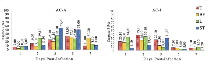 Fig. 3. Caspase-3% on the lymphoreticular organs. Domestic chickens (AC-A) and Alabio ducks (AC-I) infected with ducks/Aceh Besar_IND/2013/eoAC080721 isolate. T: thymus, BF: Bursa of fabricious, L: Spleen, ST: Ceca tonsils. The different bird species used in this research showed that the severe immunopositive reaction found in the gastrointestinal and lymphoreticular organs in Alabio duck proved that although Alabio ducks do not show ND clinical symptoms, inside their body, NDV was present in high concentration. The differences in clinical symptoms and lesion features that appeared on domestic chickens and Alabio ducks may be caused by different genes or protein expressions in domestic chickens and Alabio ducks that fight viral infection. According to Anis et al. (2013), the interferon-ß expression is earlier, stronger, and more intensive in duck tissue (Japanese commercial duck) compared to chicken (white leghorn SPF) upon infection by virulent NDV. In chicken, retinoic acid-induced gene-I (RIG-I) was reported to be absent. However, it was highly expressed in the duck spleen and heart (Chen et al., 2013, 2015). The absence of RIG-I is hypothesized to make chicken less resistant to the influenza virus than duck as its natural reservoir (Barber et al., 2010). Kang et al. (2015) explained that RIG-I is identified as a cytoplasmic censor against RNA virus, which is important in initiating the nonspecific immune response.