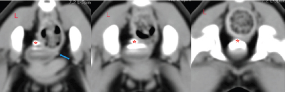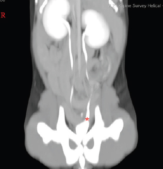 Fig. 1. Post-contrast dorsal reconstructed CT study image. Red star indicates the caudal portion of the left ureter, which is expanded and might indicate a forming mild hydroureter. The dog was anesthetized using dexmedetomidine (Dexdomitor ® 0.5 mg/ml–0.04 ml i.m.), butorphanol (Butomidor ® 10 mg/ml–0.04 ml i.m.), and ketamine (Ketamidor ® 10%–0.01 ml i.m.). Propofol (Propofol Fresenius ® 10 mg/ml–0.5 ml i.v.) and midazolam (Fulsed ® 5 mg/ml–0.1 ml i.v.) were used for induction. Maintenance was achieved with inhalation of isoflurane anesthetic gasses (2% minimum alveolar concentration (MAC)). A 0.5 liter counterlung was used and we needed no artificial lung ventilation as the patient was stable during the procedure. We infused 50 ml of 0.9% NaCl solution intravenously to prevent hypovolemia and kept the surgical table warm to avert hypothermia. The procedure was carried out aseptically; trichotomy was made around the vulva and inner thighs. The skin was scrubbed in with a soapy povidone-iodine solution and finished off with Cutasept F® antiseptic skin solution. Sterile drapes (size 150 × 200 cm), camera covers, and gowns were used. Optic light cable and telescope were coldly disinfected in a Sekusept Aktiv® solution. The surgery aimed to cut the outer ureteral membrane and redirect left kidney-produced urine from the urethra to the bladder. Before cutting, a hydrophilic 3 Fr catheter was introduced through a pathologic left ureter opening. It worked as a guide to fully visualize the intramural ureteral tunnel. After that, a Karl Storz monopolar coagulating ball electrode (3 Fr × 53 cm) was introduced through the working channel of the cystoscope sheath. The electrode cut the medial aspect of the ureteral wall up to the bladder trigone, where the contralateral normal ureter opens. The cut membrane did not bleed during the surgery (Figs. 6–8).