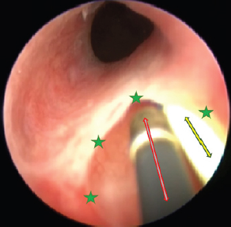 Fig. 6. Cystoscopy picture where the ureteral membrane (see the green stars) is seen before cutting with the semirigid Karl Storz monopolar coagulating ball electrode (marked with a red arrow). A bright yellow 3 Fr guide catheter is seen on the right side of the picture (marked with a yellow arrow). One week postoperation, a control cystoscopy was performed. The ureter looked well healed; therefore, we took out the pigtail catheter. The owner stated that the dog experienced no pain or discomfort after the surgery, apart from catheter-caused stranguria. Dermatitis resolved quicker than expected because the urine stopped leaking immediately after the procedure. Two weeks later, the owner reported that urine still leaks at night; ergo, a medical treatment was started by prescribing phenylpropanolamine (Propalin® 40 mg/ml syrup–0.1 ml TID 30 minutes before meals, p.o.). Nine months after the surgery, we formed a telephone questionnaire and evaluated owner’s answers about the dog. Urine incontinence level was reported to be 0/3 (3 being constant leak and 0 being no leak whatsoever). Dermatitis has never returned. Urination is normal, just like in a healthy dog. We found out that the animal still gets phenylpropanolamine syrup occasionally; hence, we repeated the questionnaire 2 weeks after stopping the medication. The results showed that 3 days after stopping the drug, she had a mild leakage at night. But after that, full continence was achieved. It is important to note that even being a grown-up dog now (1 year and 2 months), she never had her first heat, which might be due to the complex urogenital tract pathologies. The questionnaire also sought to evaluate the burden of having a dog that cannot urinate properly. It was stated that dealing with this sort of problem is a huge affliction. Extra time, expenses, and efforts must be taken into consideration. In the last question, the owner evaluated the diagnostics, surgery, and healing processes to be 5/5 (with 5 being very satisfactory and 0 being not satisfactory at all). They would repeat it if needed and recommend it to other animal owners. Ethical approvalAll clinical procedures with the animal followed in this study were in accordance with Lithuanian (The Republic of Lithuania Law on Welfare and Protection of Animals No. XI-2271) and European legislation for the protection of animals. DiscussionIntramural ectopy type is a fortunate pathology in a way that there are multiple options of surgical management for it. We believe that a minimally invasive approach is best suitable for the patients and their owners. Unfortunately, laser ablation surgery, which is known for decent outcomes, requires a lot of specific and expensive equipment. Diode or Holmium: yttrium aluminum garnet laser fibers are usually used. Apart from it being very specific hardware, certain knowledge must be attained to use it (Smith et al., 2010). What is more, in our area, the estimated price for laser ablation equipment was five times higher than for monopolar cauterization. Studies report that laser ablation surgery resulted in urine continence without any additional treatment in 47% and 63% of the patients (Berent et al., 2012; Hoey et al., 2021). Monopolar cautery is still a new concept, and the only case report in veterinary literature resulted in a comeback of urinary incontinence (Ferreira et al., 2019). But a few human studies using this tool were successful. First, ectopic ureter management with monopolar electrocautery in human infants was used to create a new ureteral outlet into the bladder (Ortiz et al., 2017). Second, monopolar heat probe electrode (2 Fr=2/3 mm, 20 V) was used to successfully manage human ureteral stump syndrome after nephrectomy (Fernández-Bautista et al., 2019).