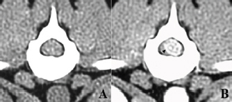 Fig. 1. Computed tomographic findings at T13 of the case. (A) Without contrast medium, (B) with an intravenous administration of contrast medium. A clear contrast-enhanced mass lesion of the spinal cord could be observed in the contrast study (B, arrow head). The dog was fixed in ventral recumbency, and a midline thoracolumbar skin incision was made. The muscles around the T13 spinous process were bluntly detached to expose the spinous process, which was then resected. Then, laminectomy was carried out to expose the spinal dura mater, which appeared slightly red. The dura was incised, and dark red tumor tissue was identified (Fig. 2A). Subsequently, the tumor tissue swelled and protruded outward (Fig. 2B). The protruding tumor tissue seemed well demarcated from the spinal cord, suggesting that the tumor was extramedullary rather than intramedullary. After a portion of the tumor tissue was biopsied, gross total resection was carried out using an ultrasonic surgical aspirator (Sonopet®; StrykerJapan KK, Tokyo, Japan) (Fig. 2C). After tumor removal, the dura was left unsutured, and the muscular, subcutaneous tissue and skin were closed. Antibiotics and corticosteroids were administered orally for 3 weeks after surgery. The dog’s postoperative recovery was unremarkable. The surgical specimen was formalin-fixed and used for routine hematoxylin and eosin (HE) staining. The surgical specimen consisted of extensive necrotic foci and tumor cell growth foci, and many tumor cells proliferated while forming a tubular structure. The cells in the tubular formation had oval nuclei arranged on the basement membrane side and clear cytoplasm on the luminal side. These histopathological features are consistent with previously reported spinal nephroblastoma (Fig. 2D) (Ohta et al., 2009; Brewer et al., 2011; Liebel et al., 2011). Mitotic figures were less frequent at all sites examined. She had a normal appetite on the day after the operation. Two weeks after surgery, the dog gradually was able to walk and resume normal activities. She received postoperative radiation (20 Gyin 5 fractions) using an orthovoltage radiation therapy device (MBR-320, Hitachi Medico, Tokyo, Japan). For the radiation treatment, the dog was anesthetized and placed in ventral recumbency. The spinal cord in which the tumor tissue was present was irradiated with a single dose of 4 Gyusing 4-cm square tubes (300 kVp, 20 mA). Prior to starting radiation therapy, a total dose of 40 Gy was planned; however, due to sufficient recovery of the dog, the owner did not wish for further treatment at the time of 20-Gy irradiation.