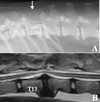 Fig. 3. Radiographic and MRI findings of the thoracolumbar spine of the case 9 years after surgery. (A) Radiographic features of spondylosis deformans were observed in both T13–L1 and L2–3. The spinous process of T13 was missing due to laminectomy (white arrow). (B) MRI (T2-weighted image) showed that the spinal cord was slightly compressed from the ventral side in T13–L1, probably due to the proliferation of bone tissue due to spinal instability. No tumor tissue was observed in the spinal cord. The reason for the good prognosis, in this case, remains unknown; multiple factors are likely involved. The gross appearance of the tumors at the time of surgery was well demarcated from the spinal cord with clear margins, which allowed gross total resection. Although spinal nephroblastoma has been classically reported as an extramedullary lesion (Summers et al., 1988; Vaughan-Scott et al., 1999), some cases have been reported as intramedullary (Jeffery and Phillips, 1995; Macri et al., 1997; Sale et al., 2004; Liebel et al., 2011; Higgers et al., 2017; Tagawa et al., 2020). In a series of 10 canine spinal nephroblastoma cases, Liebel et al. (2011) reported a longer survival in dogs with extramedullary lesions. Intramedullary tumor development may detrimentally affect neurologic outcomes and survival by precluding complete surgical resection, resulting in local recurrence. The most important reason for the long survival in our case was likely the relatively localized presence of extramedullary tumor tissue. Besides the difference in the site of tumor development, the difference in malignancy of the tumor cells is considered one of the factors responsible for the good prognosis in this case. In one report of canine spinal nephroblastoma focusing on tumor cell growth analysis, the case was highly malignant based on its high potential for growth and invasion (Ohta et al., 2009), indicating some differences in malignancy among tumor tissues of the same histopathological type. Recently, intraspinal metastasis of spinal cord nephroblastoma was reported, which is considered a highly malignant finding (Terrell et al., 2000). Since the histopathological examination in our case showed infrequent mitotic figures, this case might have had relatively low malignancy, leading to a good prognosis. Although gross total resection was achieved in this case, residual tumor cells may have remained. Therefore, postoperative treatment is necessary. We elected to perform local radiation therapy because the effectiveness of chemotherapy has not been reported in dogs. In this case, only 20 Gy was applied after surgery at the owner’s request. However, our case cannot draw conclusions regarding postoperative treatment, and further evaluations are needed to determine suitable adjunctive treatments after surgical resection of this disease. This case fell into a serious condition, such as being unable to stand up due to a spinal cord tumor at an early age; however, the dog was able to almost reach the end of her life while maintaining a normal walking ability using a combination of surgery and radiation therapy. This case strongly suggests that providing intensive treatment for canine spinal nephroblastoma is very important. AcknowledgmentThe authors thank the Edanz Group (https://en-author-services.edanz.com/ac) and Editage (www.editage.com) for editing a draft of this manuscript. Conflict of interestNone of the authors of this article has a financial or personal relationship with other people or organizations that could inappropriately influence or bias the content of this paper. Authors’ contributionsThe diagnostic imaging at the first visit of this case was performed by Munekazu Nakaichi. Surgical treatment and postoperative management of the case were performed by Munekazu Nakaichi, Hiro Horikirien, Harumichi Ito, and Hirosi Sunahara. Postoperative radiation therapy was performed by Toshie Iseri and Yuki Nemoto. Munekzu Nakaichi, Kenji Tani, and Kazuhito Itamoto were involved in the writing of the first draft, and all authors read and approved the final draft. ReferencesBrewer, D.M., Cerda-Gonzalez, S., Dewey, C.W., Diep, A.N., Van Horne, K. and McDonough, S.P. 2011. Spinal cord nephroblastoma in dogs: 11 cases (1985-2007). J. Am. Vet. Med. Assoc. 238, 618–624. Higgers, R.J., Bollen, A.W. and Dickinson, P.J. 2017. Tumors of the nervous system. In Tumors in domestic animals, 5th ed. Ed., Meuten, D.J. Hoboken, NJ: Wiley Blackwell, pp: 834–891. Jeffery, N.D. and Phillips, S.M. 1995. Surgical treatment of intramedullary spinal cord neoplasia in two dogs. J. Small Anim. Pract. 36, 553–557. Liebel, F.X., Rossmeisl, J.H., Jr., Lanz, O.I. and Robertson, J.L. 2011. Canine spinal nephroblastoma: long-term outcomes associated with treatment of 10 cases (1996-2009). Vet. Surg. 40, 244–252. Macri, N.P., Van Alstine, W. and Coolman, R.A. 1997. Canine spinal nephroblastoma. J. Am. Anim. Hosp. Assoc. 33, 302–306. Nakade, T., Inoue, A., Shimazaki, H., Miyoshi, K., Takeuchi, N., Kadosawa, T., Akihara, Y., Taniyama, H. and Ishida, O. 2006. Spinal nephroblastoma in a miniature Dachshund. J. Vet. Med. Sci. 68, 1383–1385. Ohta, G., Kobayashi, M., Sakai, H., Masegi, T. and Yanai, T. 2009. Proliferative potential of a spinal nephroblastoma in a young dog. J. Toxicol. Pathol. 22, 79–82. Rossmeisl, J.H., Jr. and Pancotto, T.E. 2020. Tumors of the nervous system. In Withrow and MacEwen’s small animal clinical oncology, 6th ed. Eds., Vail, D.M., Thamm, D.H. and Liptak, J. St. Louis, MO: Elsevier, pp: 657–674. Sale, C.S., Skerritt, G.C. and Smith, K.C. 2004. Spinal nephroblastoma in a crossbreed dog. J. Small Anim. Pract. 45, 267–271. Summers, B.A., deLahunta, A., McEntee, M. and Kuhajda, F.P. 1988. A novel intradural extramedullary spinal cord tumor in young dogs. Acta. Neuropathol. 75, 402–410. Tagawa, M., Shimbo, G., Tomihari, M., Yanagawa, M., Watanabe, K.I., Horiuchi, N., Kobayashi, Y. and Miyahara, K. 2020. Intra