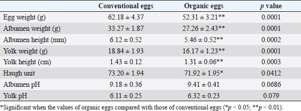 The present work reports that cholesterol content in organic egg yolk is significantly (p < 0.01) lower than those in conventional egg yolk. The data reported in Table 3 have pointed out that the mean levels of vitamins A and D are significantly (p < 0.01) higher in organic egg yolk compared with conventional egg yolk, which indicates a significant increase in the level of vitamins A and D in organic eggs. Currently, the reported results as in Table 3 indicate that the mineral contents of egg yolk in conventional table eggs are remarkably greater than those in organic ones whereas levels of Ca, Mg, and Zn, in the yolk of organic eggs are significantly lower than those in conventional type. The microbial inhibition test used in the present study is a qualitative assay used for quick and easy screening of many samples to detect many antibiotics. Table 4 shows that all examined organic eggs were free from antimicrobial residues, while 12% and 8% of conventional egg yolk and conventional egg white were positive for antimicrobial residues, respectively. DiscussionThe production of organic food has been based on special standards, so it is considered safe food and environmentally friendly, and free from chemical residues (Kouba, 2003; Newerli-Guz and Śmiechowska, 2004). Chicken eggs are one of the most specific foods that are organically produced worldwide. Organic eggs, also called firewood eggs or native eggs, are laid by free-range or native hens, whereas those hens have been raised on natural organic food and grown in healthy natural environments (Dangour et al., 2010). Consumers form their first impressions of products based on their external appearance of eggshells, but the physical features of the internal egg components are as crucial for ensuring the safety, soundness, and wholesomeness of the product. Table eggs are like a sealed box; if they do not meet expectations, consumer confidence begins to decline (Ansah et al., 2009). In the current study, the external and internal qualities of 200 conventional and 200 organic eggs sold in retail markets in the Aswan Governorate were compared. The results have shown that the percentage of organic eggs with a dirty shell, and other quality parameters is lower than that of the conventional eggs. The shell of the normal egg should be smooth, clean, and free from cracks to avoid penetration by microorganisms according to the guidelines established by the USDA (USDA, 2000). Eggs get contaminated during the laying process, transportation, and storage, or from fecal matters, litter materials, dust, clothes, and hands of the workers (De Reu et al., 2006). Eggs with a dirty shell are of lower quality, and in certain countries, they cannot be sold or used for human consumption (Jacob et al., 2011). Rough shell defect may be inherited, or because of excessive use of antibiotics, excess Ca supplementation, copper deficiency, and some diseases such as infectious laryngotracheitis, Newcastle disease, and infectious bronchitis (Beyer, 2005). While shell cracks may be because of bad handling or thinning of eggshell. Different feeding regimen that does not provide the organic hens with the sufficient amount of micronutrients needed to increase their production can have negative effects on eggshell breaking strength (Minelli et al., 2007). Similar results were reported previously (Hafez et al., 2013; Ebied et al., 2021). Small blood spots are caused by the rupture of small blood vessels and ovarian hemorrhage during egg formation. This defect may be inherited, or because of ovarian diseases, vitamin K deficiency, high ambient temperature, old age hens, and using sulfa drugs and antibiotics (Jacob et al., 2011). Meat spot is defined as any foreign body inside the egg except the heat spot. They may be fatty, fleshy. or liver-like materials floating freely in the white or embedded in chalazae or attached to the yolk. Egg with meat spot and tainted eggs are considered unfit for human consumption (Karmi et al., 2019). Consumers usually prefer larger eggs (USDA, 2000), variations in egg weight among different sources can affect different egg parts, this difference may be attributed to the age and strain of the hens (Alsaffar et al., 2013), nutritional contents of the hens’ diet (i.e., protein, fat, minerals, vitamins and total energy), housing system and density, environmental stress, health status, and feed intake (Attia et al., 2014; Bovera et al., 2014). The obtained data in the present study (Table 2) indicates that eggs from the organic system are remarkably smaller and lighter than conventional eggs whereas the mean value of egg weight, albumen weight, albumen height, yolk weight, yolk height, and Haugh unit are significantly higher in conventional eggs than those in organic eggs. Moreover, no significant alterations in values of albumen pH or yolk pH are demonstrated between organic eggs and conventional eggs through the current study. The results were consistent with the previous articles reported by Śmiechowska and Dmowski (2005); Minelli et al. (2007); Hafez et al. (2013). The alteration in size, weight, pH values, albumin, and yolk highest may be due to the way the eggs were stored at the point of sale. Refrigeration of egg at the point of sale is not required in European Union (EU) and Latin America to avoid excessive rising in cost (Da Silva Pires et al., 2020). In Egypt, too that is not required. Da Silva Pires et al. (2021a, 2021b) reported that egg coating is also a potent factor to reduce weight loss by covering the shell pores. The egg quality may be affected also due to the farming systems, birds’ genotype, nutrition strategy, and cages used can have a direct influence on egg quality (DalleZotte et al., 2021; Alig et al., 2023b). Table 2. Mean values of raw eggs characteristics traits in conventional (n=200) and organic (n=200) eggs.