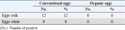 Table 4. Detection of antimicrobial residues in the yolk and white of examined eggs in conventional (n=200) and organic (n=200) eggs.