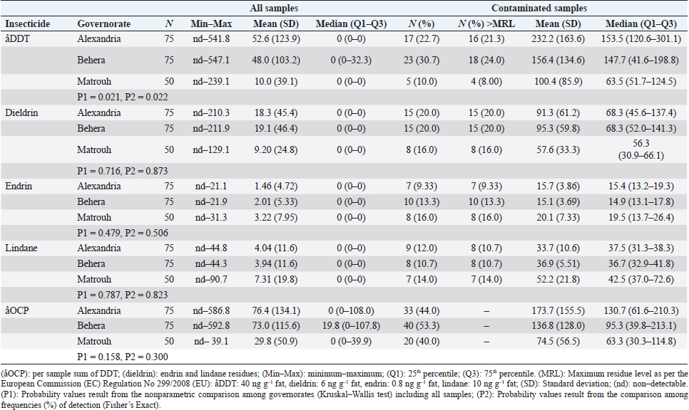 AbstractBackground: For decades, the use of organochlorine (OC) pesticides has had a detrimental effect on the environment and human health. Contamination of soil, water, and air has also resulted in contaminated milk. Aim: The purpose of this study was to investigate if any OC residues dichlorodiphenyltrichloroethane (DDT, Dieldrin, Endrin, and Lindane) were present in raw bovine milk from West Delta, Egypt. Methods: 200 fresh raw cow milk samples (500 ml of each sample) collected from three different governorates, west Delta, Egypt, for determination of OC pesticides residues using gas chromatography with an Agilent 6890A model gas chromatograph equipped with a 63Ni microelectron capture detector. Results: The obtained results revealed that åDDT, dieldrin, endrin, and lindane were detected in Alexandria, Behera, and Matrouh at incidence levels (22.7%, 30.7%, and 10%), (20%, 20%, and 16%), (9.33%, 13.3%, and 16%), and (12%, 10.7%, and 14%) with mean values of 232.2 ± 163.6, 156.4 ± 134.6 and 100.4 ± 85.9; 91.3 ± 61.2, 95.3 ± 59.8 and 57.6 ± 3.33; 15.7± 3.86, 15.1 ± 3.96 and 20.1 ± 7.33; 33.7 ± 10.6, 36.9 ± 5.51 and 52.2 ± 21.8 ng/g fat, respectively. El-Behera was the most contaminated province with an incidence level of 53.3% with a mean value of 136.8 ± 128.0 ng/g fat, followed by Alexandria at 44% with a mean value of 173.7 ± 155.5 ng/g fat, and finally, Matrouh 40% with a mean value of 74.5 ± 56.5 ng/g fat. Conclusion: This research demonstrated that milk samples contain varying levels of OC pesticide residues, which can be hazardous to consumer health. Therefore, to safeguard consumers, especially children, and the elderly, OC pesticide residues in milk must be closely monitored. Keywords: Bovine milk, Gas chromatography, Organochlorine. IntroductionOrganochlorine (OC) pesticides are highly toxic, long-lasting pollutants that can harm the environment and human health. These compounds can cause chronic toxicity more quickly than other pesticides, such as organophosphorus pesticides (Abou Donia et al., 2010). OC pesticides have been found to contaminate milk, posing a serious risk to infants, children, and adults who consume it. In recent years, this has become a major concern due to the vast milk consumption (Fontcuberta et al., 2008). Previous studies showed that over 90% of the typical human intake of polychlorinated biphenyls and OC compounds during the past few years came from food of animal origin (Dirtu and Covaci, 2010). OC pesticides, especially dichlorodiphenyltrichloroethane (DDT) and hexachlorocyclohexane (HCHs), together with the cyclodienes such as aldrin, dieldrin, chlordane, and heptachlor were found in milk and dairy products during the last decades, and they were mentioned in different studies (Tsiplakou et al., 2010; Aslam et al., 2013; Nasef et al., 2019). DDT was one of the most widely used organochloride pesticides because it could kill various insects, was inexpensive to produce, and had no odor (Lallas, 2001). In this regard, foods high in fat, such as meat, fish, and dairy products, are the main way people are exposed to OCs (Jayaraj et al., 2017). Milk stands out among them because, in addition to its derivatives being widely used in the human diet, it is an essential nutrient for children’s growth. Therefore, to reduce the risk to human health, it is necessary to continuously evaluate OCP levels, especially in milk (Luzardo et al., 2012; Avancini et al., 2013). Compounds containing OC are lipophilic and undergo minimal metabolization in living things. Therefore, these chemicals accumulate and stay in adipose tissue due to environmental exposure (Falandysz et al., 2004). Additionally, pesticides are biomagnified in the food chain, which leads to chronic toxicity after prolonged exposure (Borga et al., 2001). Although the long-term effects of pesticides from contaminated food on human health are poorly understood, there is growing proof that they are genotoxic, carcinogenic, and disturb hormonal processes (Ledoux, 2011). Due to water contamination, the application of pesticides to treat ectoparasites directly on the animal, intake of polluted pastures and meals, and pesticide residues, it is possible to find pesticide residues or their metabolites in milk (Bajwa and Sandhu, 2014). Milk is used as an indicator to assess the persistence of chemicals in agriculture and environmental pollution since the presence of these substances in milk may pose a concern to public health. Maximum residue levels (MRLs) for pesticide residues in products of plant and animal origin have been defined to safeguard consumers and advance commerce. The MRLs for the target°C pesticides dichloro-diphenyl-trichloroethane and endrin in milk have been set by legislation in the European Union at 40 and 0.8 ng/g, respectively (EC, 2005). In Egypt, OC is still widely used in Egypt’s agriculture, despite the country’s ban on its use. Therefore, this study aimed to monitor the levels of OC residues (DDT, Endrin, Dieldrin, and Lindane) in raw cow’s milk from three provinces in West Delta, Egypt. Materials and MethodsCollection of samples200 fresh raw cow’s milk samples were gathered randomly from local markets in Egypt’s West Delta region, including Alexandria (75 samples), El-Behera (75 samples), and Matrouh (50 samples) provinces in Egypt. Samples were kept frozen at −20°C before analysis. Chemical and reagentHexane, petroleum ether for chromatography, and 60/100 mesh pesticide reagent grade Florisil were obtained from Mallinckrodt Backer (Kentucky, USA). Florisil was previously activated at 150°C/12 hours and deactivated by adding 2% Milli-Q water before use. Standard OC pesticides (DDT, dieldrin, endrin, and lindane) were obtained from Ultra Scientific (North Kingstown, RI). All other reagents used were of analytical reagent grade. All glassware used was previously washed with distilled water, rinsed with hexane and acetone alternately, and dried at 150°C t