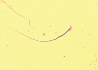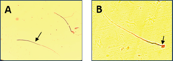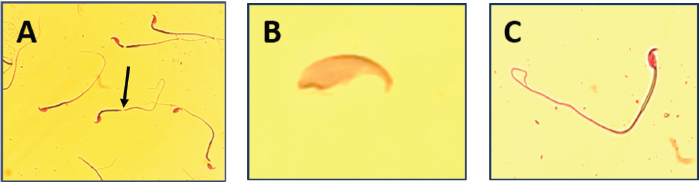 Fig. 2. Microscopic observation of sperm tail abnormalities (400×). (A) Irregular tail; (B) tailless head; and (C) coiled tail.