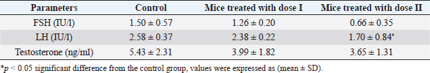 AbstractBackground: Dimethoate (DM) is one of the most important organophosphate insecticides used for controlling many pests which affect vegetables, fruits, and agricultural crops, its persistence in soils and crops could cause a health hazard to humans as well as other non-target organisms. Aim: This study was conducted to evaluate the effect of the recommended dose and its double of DM on sex hormones, sperm morphology, and fertility of adult male mice. Methods: Twenty-seven Swiss albino adult male mice were divided into three groups of nine animals each: control group received distilled water only, while other groups received DM orally at doses (0.1 and 0.2 ml DM/100 ml distilled water) for 20 days, at the end of the treatment, six mice from each group were sacrificed. The sperm morphology was evaluated and sex hormones were measured. Three mice from each group were allowed to mate with untreated females (1:2). Result: The results revealed a decrease in luteinizing hormone levels in mice treated with (0.2 ml DM/100 ml distilled water) compared with the control group while the levels of follicle-stimulating hormone and testosterone did not record any significant differences. Also, the results demonstrated a significant increase in abnormal sperm morphology such as head and tail. The fertility was reduced and the average number of dead embryos increased while the average number of live embryos decreased. Conclusion: This current study confirmed that DM has detrimental effects on sperm morphology, fertility, and the embryos; therefore, more efforts should be exerted to protect ourselves and our environment from the harmful effects of this pesticide. Keywords: Dimethoate, Male mice, Reproduction, Sex hormones. IntroductionPesticides are used in agriculture to enhance food production, especially in developing countries (Prakasam et al., 2001) and controlling insects and disease vectors (Farag et al., 2007). They can be harmful to humans and animals (Khogali et al., 2005) and cause environmental contamination (Tuzmen et al., 2008). Organophosphate insecticides (OPI) constitute one of the most widely used classes of pesticides for pest control (Selimen et al., 2014). They have toxic effects on many organs and systems such as the immune system, reproductive system, and nervous system (Yasin and Sharma, 2013), and can alter the genetic material particularly chromosomes in mammalian culture (Jamil et al., 2004). In addition, several physiological and behavioral dysfunctions occurred after exposure to light doses of OPI (Ambali et al., 2011; Ngoula et al., 2014). Dimethoate (DM) is one of the most used OPI for controlling many pests as botflies in livestock (Abouamer et al., 2013), the insects affecting vegetables, fruits and agricultural crops (Mandal et al., 2002, 2008; Abouamer et al., 2013). It can affect humans and wildlife in their natural habitats (Ngoula et al., 2014). Moreover, DM products are moderately toxic to higher vertebrates by ingestion, inhalation, and dermal absorption (Verma and Mohanty, 2009). Several studies reported that DM has harmful effects on liver (Heikal et al., 2011; Saafi et al., 2011; Al-Ali et al., 2016), ovary (Farag et al., 2007), brain (Astiz et al., 2009), blood parameters (Yasin and Sharma, 2013), the embryos (Sasi et al., 2013) and also induce DNA damage in mice bone marrow (Ayed-Boussema et al., 2012). Many studies have shown that male mice treated with DM caused a decrease in sperm motility and an increase in the percentage of abnormal sperm (Jallouli et al., 2015; Sasi et al., 2018a, 2018b), as well as structural alterations in testicular tissues (Bakir et al., 2020; Sasi and ELGhoul, 2021). The main objective of this study was to investigate the effect of the recommended dose of DM and its double on sex hormones, sperm morphology, and fertility in adult male mice. Materials and MethodsChemicalsDM (40% EC, good quality, Germany) which was used in this study was bought from Soliman Khater Market (Tripoli-Libya) in the shape of a volumetric bottle (250 ml). It was used to prepare the required doses. The working solution was prepared weekly and maintained in dark glass bottles at room temperature (25°C). Experimental animalsTwenty-seven Swiss albino male mice weighing between (20 and 27 g), aging between 8 to 12 weeks and free of any pathogen or external parasites. The mice were bred in the animal house of the Department of Zoology, Faculty of Science, University of Tripoli, Libya. They were housed in plastic cages containing wooden flakes which were changed weekly and kept under controlled temperature conditions (22°C ± 3°C) and a normal photoperiod of 12 hours dark/12 hours light. They were given a standard diet and water ad libitum. Experimental designThe animals were randomly divided into three groups of nine mice each and were put in separate cages and treated as follows: group I: control mice were orally given distilled water, while groups II and III received DM by gavage at the doses; dose I (0.1 ml DM/100 ml distilled water) and dose II (0.2 ml DM/100 ml distilled water), the experiments were continued for 20 days. Sperm suspension preparationAfter 24 hours of the last day of the treatment, six mice from each group were weighed prior to sacrifice. The mice were sacrificed by rapid cervical dislocation. Sperm samples were collected by squeezing vas deferens into 1 ml of physiological normal saline (0.9% NaCl) in a small dish. The sperm suspension was incubated for 10 minutes at 37°C to prevent sperm adherence, while the rest number of the mice from each group were used for a fertility test. Determination of sperm morphologySperm morphology observation was done by making smears from sperm suspension. One drop of sperm suspension was placed on a clean slide and smears were made and allowed to dry in air. Smears were stained with 1% eosin for 10 minutes. Sperm morphology was observed at 400× magnification using a light microscope, and then the n