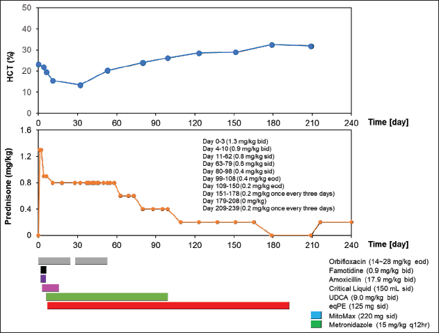 Fig. 1. Clinical course of treatment with oral administration of drugs and supplements between day 0 and day 209. Changes in HCT values from day 0 to day 209 of the treatment period (upper). Variation in oral prednisone doses from day 0 to 240 of the treatment period (middle). Amount and duration of oral medications and supplements used from day 0 to day 240 of treatment (lower). On day 32, good physical condition was maintained. Compared to day 18, the WBC count decreased by 46.1% but remained above baseline. RBC, HCT, and HGB decreased by 30.4%, 13.6%, and 34%, respectively, but remained below the baseline. The MCV increased by 24.3%, which was converted from within reference to the above reference. The MCH and PLT were normal. MCHC and LYM decreased by 23.7% and 39.7%, respectively, and were converted from within reference to the reference below. The EO decreased by 56.7%, which was converted from the above reference to within reference. GGT was normal. CRP decreased by 64%, which was converted from the above reference to the within reference. Based on these results, orbifloxacin was deemed unnecessary and thus discontinued. The owner of the patient reported mobile forelimbs, but the patient could not stand on. The owners also reported a tremor, hard and infrequent, stools, and an apparently tense abdomen, and ascites were excluded as a differential on day 37. Orbifloxacin (14–28 mg/kg) was resumed orally from day 38. On day 53, the patient’s physical condition was maintained. Compared to day 32, WBC and MCV decreased by 14.4% and 0.4%, respectively, but remained above the baseline. The RBC, HCT, and HGB levels increased by 51.9%, 51.5%, and 91.4%, respectively, but remained below the baseline. MCH and PLT increased by 26% and 37%, respectively, which were converted from within reference to the above reference. MCHC and LYM increased by 26.4% and 231.8%, respectively, from below the reference values. EO increased by 7.2%, which was converted from within reference to the above reference. ALT decreased by 61.7% compared to that on day 11 but remained above baseline. GGT and CRP levels remained at reference values. On day 63, since the patient continued to feel well, oral orbifloxacin administration was deemed unnecessary and discontinued. In addition, oral prednisone was changed from 0.8 mg/kg sid to 0.6 mg/kg sid thereafter. Between days 80 and 209, the patient’s physical condition continued to be maintained. Although the WBC count remained above the reference level, it showed a decreasing slope as the days passed. The RBC count remained below the reference value, but gradually increased over days and then reached within the reference value on day 209. However, HCT and HGB remained below the standard values and exhibited a gradual upward movement with passaging days. Although MCV, MCH, and PLT were above the reference values, they gradually decreased over time and converted to reference values on days 99, 123, and 179, respectively. The MCHC remained within the reference value. LYM was temporarily below the reference value on day 151, but otherwise remained within the reference values. The EO level was within and above the reference level between days 80 and 209. Although ALT was above the reference level, it showed a decrease with passaging days and then remained constant at around 110 (U/L). Although GGT was within the standard value, it decreased over time and then remained below the standard value after day 99. CRP levels remained normal but slightly exceeded the standard value on day 209. Under these trends of improvement in blood tests, oral prednisone was tapered from 0.6 to 0.4 mg/kg sid on day 80, tapered from 0.4 mg/kg sid to 0.4 mg/kg eod on day 99, and tapered from 0.4 to 0.2 mg/kg eod on day 99, tapered to 0.4 mg/kg sid to 0.4 mg/kg eod on day 109, and tapered to 0.2 mg/kg eod to 0.2 mg/kg once every 3 days on day 151. Oral prednisone was temporarily discontinued on day 179, but oral dosing (0.2 mg/kg once every 3 days was resumed on day 209. On day 216, diarrhea was observed on day 214, and MitoMax (220 mg sid) and metronidazole (15 mg/kg q12 hours) were administered orally. Diarrhea resolved after several days. Table 2. Hematological and serum biochemical parameters after drugs and supplements administration between day 4 and day 209.