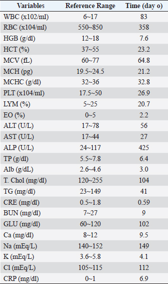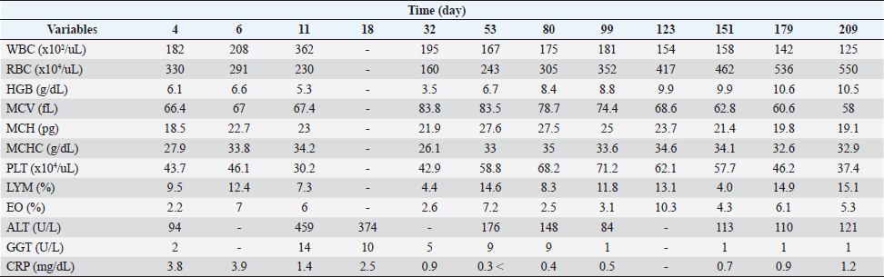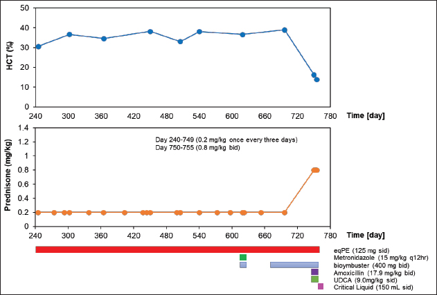 Figure 1 and Table 2 show the history of therapeutic and supplement use, and changes in blood test values over time between days 0 and 209. On day 1, the patient was observed to be in good health and consumed a small amount of meat, including a small amount of white meat. However, since the patient vomited a little saliva early in the morning and did not have food at night, which affected treatment compliance for famotidine (0.9 mg/kg bis in die: bid) and amoxicillin (17.9 mg/kg bid) as they were orally administered. On day 2, since it was observed that the patient could eat only his favorite snacks, critical liquid (150 ml, semel in die: sid) was administered orally. On day 4, the patient could eat pet food and had an increase in appetite. Blood test findings showed that WBC levels were 2.2 times higher than those at the initial visit, while RBC, HCT, HGB, MCH, and MCHC were 7.8%, 5.6%, 19.7%, 12.7%, and 14.9% lower, respectively. However, MCV, PLT, LYM, and EO levels were normal. Although the CRP level had decreased to approximately 45% of the level at the time of the initial visit, it was 3.8 times the upper limit of the reference value. Based on these results, the oral dose of prednisone was tapered from 1.3 mg/kg bid to 0.9 mg/kg bid. Gamma-glutamyl transpeptidase (GGT) levels were within the reference limits, while the ALT levels were found to be 68% higher than those at the initial visit, resulting in the administration of ursodeoxycholic acid (UDCA) at 9 mg/kg bid to assist with liver function. On day 6, compared to the previous examination on day 4, the WBC count increased by 14.3%. Additionally, EO increased by 218.2%, moving from the baseline to above the baseline, while RBC count and HCT decreased by 11.8% and 11%, respectively, which were still below the baseline values. Blood HGB increased by 8.2%, which remained below the baseline. The MCV, PLT, and LYM values were within the reference values. The MCH and MCHC increased by 22.7% and 21.2%, respectively, and were converted to be within the reference values. Based on these results, the oral dose of prednisone was changed from 1.3 mg/kg bid to 0.9 mg/kg bid. Although the patient could eat food as long as it was a snack, a recurrent loss of energy and appetite was observed. Based on these observations, equine placenta extract (eqPE) was administered at 125 mg sid with the aim of reducing physical exhaustion and enhancing anti-inflammatory effects. In addition, ampicillin sodium (20 mg/kg) was replaced with enrofloxacin (5 mg/kg) by intravenous/subcutaneous injection under the same conditions as those on the first day. On day 11, a marked increase in appetite, without vomiting, was observed. Compared with day 6, the WBC count increased by 74%, which was above baseline. RBC, HCT, and HGB levels decreased by 21%, 20.5%, and 19.7%, respectively, which were still below the baseline values. The MCV, MCH, MCHC, PLT, and LYM levels were within the normal range. The EO level decreased by 14.3%, which was still below the normal range. The ALT level was 388.3% higher than that on day 4 and was still above baseline. GGT levels increased by 600% and changed from substandard to normal. Although the CRP level decreased by 64.1% from day 6, it was still above the baseline. Based on these results, the oral dose of prednisone was slightly tapered from 0.9 mg/kg bid to 0.8 mg/kg bid. ALT levels were 388% higher than those on day 4. GGT levels remained within the normal range. On day 18, a marked increase in appetite, without vomiting, was observed. The patient was also observed to be in good physical condition. Compared to day 11, ALT decreased by 18.5% but was still above the reference level. The CRP level increased by 8.6% and remained above the baseline. GGT level was within the reference range. On day 28, because the good physical condition of this case was confirmed to have been maintained, the prescription of orbifloxacin was deemed unnecessary and was discontinued.