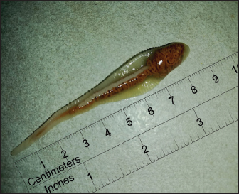 Fig. 1. Female specimen of L. serrata with a ruler showing centimeters and millimeters and indicating the actual length and general body size of the parasite. After 3 weeks, the owner reported a marked improvement in watery diarrhea and defecation frequency with only occasional self-limiting episodes of diarrhea. A follow-up visit was scheduled. The coprological examination of three samples collected on three consecutive days was negative. An aero-digestive endoscopy was performed to check the possible presence of other adult or juvenile pentastomids and to grade the chronic enteropathy. The respiratory endoscopy finding was a mild-moderate activation of the nasal-associated lymphoid tissue in the nasopharynx with no other abnormalities. The digestive endoscopy found only a mild conglutination of the duodenal villi with an irregular mucosal profile. The histopathology revealed focally moderate lymphocytic gastritis and mild to moderate lymphoplasmacytic enteritis.
