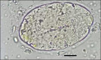 Fig. 2. Linguatula serrata egg found in the feces of a 1-year-old intact female Borzoi imported from Romania to Italy (100×, oil immersion; scale bar 10 μ). Three months after the diagnosis and treatments, the dog was re-checked. No abnormalities were identified at clinical examination, in the complete blood count, and in the biochemical profile. Morphological examination of the specimen was performed by stereoscopic microscope and SEM as follows. Under stereoscopy, the adult of L. serrata was measured again and the number of annuli was accurately counted. Length (8.7 cm) and width (0.8 cm) were confirmed and 97 annuli were counted. On the ventral view of the anterior end, a sub-terminal mouth located at the level of the first ring and four prominent hooks (two on each side of the mouth) were present. The first pair of hooks was located lateral to and closer to the mouth at the level of the first ring, while the second pair was located lateral but somewhat further away and slightly lower at the level of the second ring. The cephalic central part and caudal parts of the adult were then dissected and examined using SEM (JEOL JSM 5410SEM). To obtain SEM images, the samples were washed in 70% ethanol and dehydrated using an ethanol graduated series. The alcohol has been replaced by liquid CO2 which, through the drying procedure at the critical point, has passed from the liquid state to the gaseous state. The dried samples were mounted on the stubs using double-sided conductive tape. The samples were metalized with a layer of gold of about 10 nm using the "sputtering." Finally, the samples were observed at the SEM Jeol JSM-5410 equipped with the Jeol SemAfore system for image acquisition. SEM photographs showed that the mouth was rounded, measured 3.78 × 4.03 µm, and was surrounded by a chitinous buccal cadre, while the four hooks were slightly curved and had a sharp tip (Fig. 3A and B). Each annulus had a row of pores (chloride cell caps) located on the upper part (Fig. 4A and B). A distinct terminal cleft was present at the posterior tip (Fig. 5A and B). The uterus filled with thousands of embryonating eggs was clearly visible (Fig. 6A). SEM also highlighted some morphological characteristics of the L. serrata eggs: though the egg shell appears to be smooth (Fig. 6B and C), as seen by stereomicroscopy, the surface presents irregularly distributed small pits, which give the eggs a slightly porous heterogeneous appearance (Fig. 5).