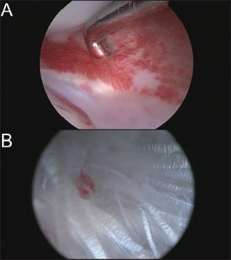 Fig. 2. (A) Arthroscopic view of inflammation of medial meniscus without structural damage. (B) Arthroscopic view of ruptured CdCL. Postoperative radiographs showed a satisfactory position of the tunnels and a good implantation of the interference screws along the drilling axes (Fig. 5). The patient was placed on full rest for eight weeks, with short lead walks only. Pain was managed with NSAIDs (Meloxicam (0.05 mg/kg)) for 6 days, and a painkiller (fentanyl patch (12 μg/hour)) for 72 hours. On day 1 post-surgery, the dog was walking on her operated leg with moderate lameness. During each postoperative consultation, two x-rays were performed (face and profile), as well as an orthopedic examination. A LOAD questionnaire was also completed. After 2 weeks, moderate lameness was observed, and radiographs showed thickening of the patellar tendon and moderate synovial inflammation; the LOAD score was 21/52. After 1 month, moderate lameness was persistent, radiographs still showed thickening of the patellar tendon and moderate synovial inflammation; the LOAD score was 13/52. After 2 months, moderate lameness was still observed, radiographs had not evolved, and the LOAD score was 7/52. After 3 months, mild lameness was observed, a mild posterior drawer was reported at orthopedic examination and moderate synovial inflammation was observed on radiographs (Fig. 6); the LOAD score was 7/52. After 6 months, very mild lameness was observed, a mild posterior drawer was reported at orthopedic examination and a resolution of the synovial inflammation was seen on radiographs (Fig. 7); the LOAD score was 5/52. After a year, a persistent yet stable mild posterior drawer was reported at the orthopedic examination but was not associated with any lameness, and the LOAD score was down to 2/52.