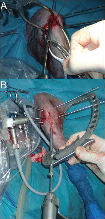 Fig. 3. (A) Femoral tunnel drilling. (B) Insertion of the 2-mm guide wire from lateral tibial metaphysis to CdCL tibia insertion under arthroscopic guidance.