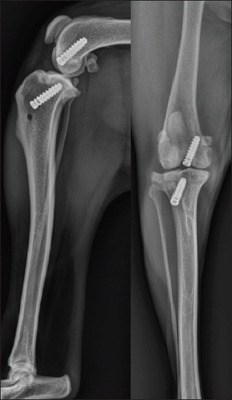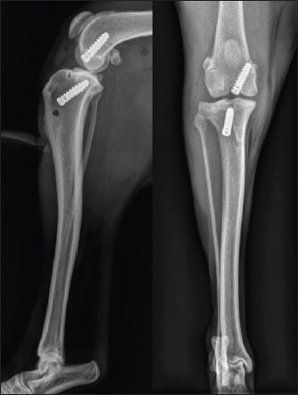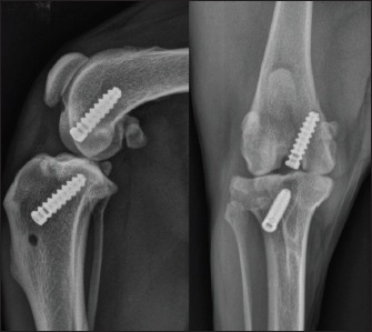 Fig. 7. 6-month postoperative radiographic views of dog's right pelvic limb from side (left) and front (right). In human medicine, the surgical indications for posterior cruciate ligament reconstruction include symptomatic severe posterior knee instability, posterior cruciate ligament avulsion with large bony fragments, or the presence of multiple ligament injuries (Veltri et al., 1995; Chen, 2007). As in dogs, there is no consensus about the surgical approach to adopt in humans. The techniques described in the literature vary according to the approach, the type of sutures, the nature of the substitution ligament, the use of arthroscopy, the orientation of the bone tunnels, and the type of screws when applicable (Sasaki et al., 2007; Gui et al., 2009; Zhang et al., 2013; Gwinner et al., 2014; Sabat et al., 2016). In dogs, synthetic reconstruction seems indicated for isolated ligament lesions in large individuals (>15–20 kg) whose growth is complete and for whom conservative treatment does not allow the resolution of clinical signs (Goin et al., 2019). Synthetic reconstruction of the ligament was performed arthroscopically as it is the most sensitive and specific technique for the evaluation of intra-articular lesions, especially meniscal lesions (Pozzi et al., 2008; Bleedorn et al., 2011; Little et al., 2014). Arthroscopy-assisted surgery also helped to reduce potential damage to the surgical site and to identify the tibial and femoral footprints of the CdCL, allowing the synthetic implant to fit the physiological localization of the ligament (Bedi and Altchek, 2009). Furthermore, arthroscopy-assisted surgery is aimed at minimizing perioperative trauma for the patient and at optimizing the chances of early recovery (Hoelzler et al., 2004). This goal was achieved with a return to weight bearing on the day following the surgery. However, using an intra-articular synthetic implant may also present risks. Barnhart and colleagues reconstructed ruptured cranial cruciate ligaments in 50 dogs using a braided synthetic material (multi-filamentous UHMWPE terathalate core contained within a braided porous non-expanded polytetrafluoroethylene sheath) (Barnhart et al., 2016). Among these 50 patients, 16 presented major complications, and nine presented minor ones (Barnhart et al., 2016). The most common complication was septic arthritis (Barnhart et al., 2016). Although no major complication occurred in this clinical case, a synovial inflammation remained present 6 months after the surgery together with mild lameness. Since the UHMWPE implant is also braided, one can hypothesize that this feature increases the risk of developing a major complication. The absence of an analysis of joint fluid makes it impossible to formally rule out septic arthritis, although no other clinical sign was observed. Finally, the implant tensioning technique used was probably the cause of excessive tension in the case presented in this study. However, the dog fully recovered clinically and recovered a normal level of activity after 6 months. LOAD results at 6 months and 1 year postoperatively were excellent. The limitations of this study include the uniqueness of the case and the absence of a magnetic resonance imaging examination, which would have provided a better postoperative assessment of soft tissues and suspected synovitis (D'Anjou et al., 2008). Similarly, carrying out a control arthroscopic examination would have helped to assess the precise positioning of the implant, perform a direct evaluation of the intra-articular structures, take a sample of the synovial membrane for histological analysis, and ensure that there was no impingement with the cranial cruciate ligament. A cytological analysis of synovial fluid puncture and the search for free synthetic particles in the joint would have completed the exploration of potential complications (Little et al., 2014). In light of the scarcity of clinical cases presenting this condition and the limited number of surgical techniques published, we believe that this technique should be considered as a possible treatment not only for isolated rupture of the CdCL but also for multiple ligament-injured stifles in dogs (Buttin et al., 2022). AcknowledgmentsThe authors thank Mrs. Cooke-Martageix for English copyediting of this article Conflicts of interestThe authors have no conflicts of interest to declare. FundingThis study was supported by the company Novetech Surgery, which provided human resources in the persons of Bastien Goin and Antonin Crumière for data processing and writing of this scientific article. Data availabilityAll the data are presented in figures directly in this article. Authors contributionsFauqueux F., DVM, performed the surgical management and follow-up controls, and wrote the article. Goin B., PhD student, and Agbalé M., DVM, wrote the article. Crumière A. J. J., PhD, Buttin P., DVM, Viguier E., DVM, Ph.D., ECVS, and Cachon T., DVM, Ph.D., ECVS, revised and improved the manuscript. ReferencesArnoczky, S.P. 1988. BSAVA Education committee commissioned article: the cruciate ligaments: the enigma of the canine stifle. J. Small Anim. Pract. 29, 71–90. Barnhart, M.D., Maritato, K., Schankereli, K., Wotton, H. and Naber, S. 2016. Evaluation of an intra-articular synthetic ligament for treatment of cranial cruciate ligament disease in dogs: a six-month prospective clinical trial. Vet. Comp. Orthop. Traumatol. 29, 491–498. Bedi, A., and Altchek, D.W. 2009. The "Footprint" anterior cruciate ligament technique: an anatomic approach to anterior cruciate ligament reconstruction. J. Arthrosc. Relat. Surg. 25, 1128–1138. Biskup, J.J. and Conzemius, M.G. 2020. Long-term arthroscopic assessment of intra-articular allografts for treatment of spontaneous cranial cruciate ligament rupture in the dog. Vet. Surg. 49, 764–771. Blanc, Q., Goin, B., Rafael, P., Moissonnier, P., Carozzo, C., Buttin, P., Cachon, T. and Viguier, E. 2019. Effect of the number of interfe