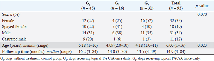 Table 2. Baseline characteristics of dogs according to their treatment group.