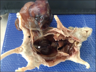 Fig. 2. Mass attached to the right uterine horn (black arrow); white arrow shows left uterine horn. The mass presented areas of epidermal differentiation with laminated keratin and sebaceous glands. Cell differentiation into digestive and respiratory epithelium, bone, cartilage, and vast areas of differentiation into nervous tissue were also present (Figs. 3–7). Moreover, the nervous tissue presented focal areas of ependymoma. Epithelial areas with hypercellularity, cell atypia, stromal microinvasion, hemorrhages, and necrosis were also observed. Metastatic epithelial cells were detected invading the pancreas, the small intestine serosa, and the mesenterium. Therefore, the mass was classified as a malignant teratoma with abdominal carcinomatosis. Ethical approvalAll animals were carefully handled following the European Guidelines for experimental studies (National Decree-law 113/2013 and European Directive 2010/63/EU). The study was approved by the National Competent Authority and by the University Ethics Committee.