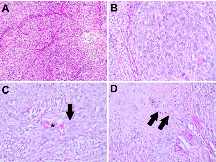 Fig. 2. Photomicrographs of a canine ureteral leiomyosarcoma hematoxylin and eosin stanning. (A) Lower magnification of neoplastic cells showing a mesenchymal cell proliferation, with areas of necrosis. HE, 10x. (B) Higher magnification of a malignant diffuse mesenchymal neoplastic cell proliferation, arranged in dense bundles, separated by stroma. Cells present a moderate anisocariosis, with evident nucleoli. HE, 40x. (C) Cells presenting eosinophilic cytoplasm, poorly delimited, sometimes vacuolized, round to oval nucleus with loose chromatin and small evident nucleolus. Examination reveals a blood vessel (asterisk) with mesenchymal malignancy and the cells invading the stroma in the direction of the blood vessel (arrow).HE, 40x. (D) Higher magnification of neoplastic cells invading tissue stroma (arrows) in the direction of blood vessels (asterisk) 40x. Table 3. Primary antibodies used in the IHC panel for primary ureteral malignant leiomyosarcoma in a mixed-breed dog.