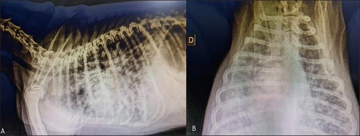 Fig. 4. Radiographic two-view projections of a canine diagnosed with ureteral well-differentiated leiomyosarcoma. (A) Latero-lateral projection showing diffuse multiple nodules in the lungs. (B) Ventrodorsal projection with diffuse multiple nodules suggestive of pulmonary metastasis. Usually, the most common clinical signs of ureteral masses include polyuria, polydipsia, pollakiuria, hematuria, urinary incontinence, and urinary tract infection (Liska and Patnaik, 1977; Font et al., 1993; Deschamps et al., 2007); however, the patient in question presented abdominal pain and distension, probably owing to the large tumor volume but without systemic and/or urinary tract-related clinical signs. The signs may be minimal or nonspecific until the mass reaches a considerable size or until hydronephrosis occurs (Crow, 1985). The main differential diagnoses for ureteral leiomyosarcomas are ureteroliths and nephroliths, which can cause abdominal pain, stranguria, hematuria, and pollakiuria. In addition, benign ureteral neoplasms, abdominal masses with consequent extramural ureteral compression, and extension of renal or bladder neoplasms should be considered differential diagnoses. Therefore, any cause of abdominal pain associated with urinary tract signs should be investigated using abdominal radiography or ultrasonography. Once the presence of neoplasms is confirmed, they must be definitively diagnosed histopathologically.