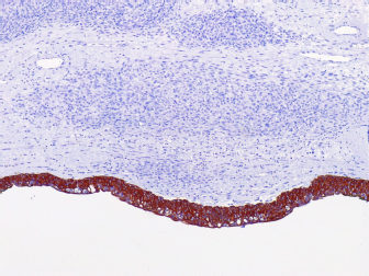 Fig. 5. Photomicrographs of a canine ureteral leiomyosarcoma. (A) Positive staining for pancytokeratin (AE1AE3) in normal urothelial mucosa in the ureter with negative staining of mesenchymal cell proliferation below, 10x. The clinical signs evidenced in this report, in which the patient had intermittent urinary incontinence, differed from those previously observed (Yap et al., 2017) and those previously reported for ureteral sarcoma (Deschamps et al., 2007) which was associated with hematuria. The clinical signs in the present case also diverged from those mentioned in the human literature (Nakajima et al., 1994), in which a woman with ureteral involvement in leiomyosarcoma had hematuria. However, the patient experienced abdominal pain in all cases. Surgical resection remains the cornerstone of ureteral neoplasm treatment through unilateral ureteronephrectomy or ureterectomy associated with ureteral anastomosis (Kulkarni and Bellamy, 2001; Guilherme et al., 2007; Troiano and Zarelli, 2007; Berent et al., 2007). In this case, we opted for unilateral ureteronephrectomy because the size of the mass made it impossible to obtain clean margins. Furthermore, ureteral resection and anastomosis can be a surgical challenge owing to the risks of urinary leakage and stenosis (Yap et al., 2017). In our case, surgical resection was the treatment of choice and adjuvant chemotherapy was not prescribed at the owner’s request. During the follow-up, distant metastases occurred, leading to respiratory distress and death. The survival time was 4 months. A case of canine ureteral leiomyosarcoma (Yap et al., 2017) was treated with ureteronephrectomy associated with adjuvant chemotherapy with doxorubicin (only one dose), and a similar survival (5.5 months) was reported, indicating that chemotherapy did not increase survival in this case. However, the patient reported previously developed progressive disease and was included in a metronomic regimen with chlorambucil 4 mg/m², but was euthanized one month later owing to progression. Another report achieved an 8-month survival in a canine patient affected by ureteral sarcoma with surgical excision as monotherapy (Deschamps et al., 2007). In a human clinical study (Nakajima et al., 1994), patients with ureteral leiomyosarcoma who underwent surgical resection associated with radiotherapy achieved a median survival of 9 years. An IHC panel was also performed as a complementary examination to further characterize ureteral leiomyosarcoma. In contrast to previous reports (Deschamps et al., 2007), we observed positive staining for smooth muscle actin and desmin. This could demonstrate the heterogeneous pattern of sarcomas not presenting all the same markers. However, with only one report presenting IHC information, it is difficult to conclude such a direct correlation. The authors believe that the lower survival rate achieved may be related to intense intraoperative hemorrhage, which may have contributed to the spread of tumor cells and may have been owing to the tumor size (12 in), indicative of malignant behavior. Information in the veterinary literature regarding the efficacy of chemotherapy in the treatment of canine ureteral leiomyosarcomas is scarce. AcknowledgmentsThe authors thank Cynthia M. Bueno, DVM, and MSc, who performed the surgery and provided technical assistance. The authors would like to thank Editage (www.editage.com) for English language editing. Conflict of interestThe authors declare no conflicts of interest. Authors’ contributionsDCS, YAR, CEF, and DSA conceived and designed the project; CMB provided technical assistance foundational to this study; DCS, YAR, and DSA acquired the data; LGDB and CEF analyzed the immunohistochemistry data; LFM, LGDB, and CEF analyzed the histopathological data; DCS, YAR, LGDB, LFM, CEF, and DSA analyzed and interpreted the data; DCS, YAR, CEF, and DSA wrote the paper. FundingThe authors did not receive any grant for this research from any funding agency in the public, commercial, or not-for-profit sectors. Data availabilityAll data are provided in the manuscript. ReferencesBerent, A.C., Weisse, C. and Bagley, D. 2007. Ureteral stenting for benign and malignant disease in dogs and cats. Vet. Surg. 36, E1–E29. Berzon, J.L. 1979. Primary leiomyosarcoma of the ureter in a dog. J. Am. Vet. Med. Assoc. 175, 374–376. Burton, C.A., Day, M.J., Hoston-Moore, A. and Holt, P.E. 1994. Ureteric fibroepithelial polyps in two dogs. J. Small Anim. Pract. 35, 593–596. Chen, L.V., Chen, N., Zhu, X., Zhang, X. and Zhong, Z. 2008. Primary leiomyosarcoma of the ureter. Asian J. Surg. 31, 191–194. Crow, S.E. 1985. Urinary tract neoplasms in dogs and cats. Comp. Cont. Ed. Pract. Vet. 7, 607–618. Deschamps, J.Y., Roux, F.A., Fantinato, M. and Albaric, O. 2007. Ureteral sarcoma in a dog. J. Small Anim. Pract. 48, 699–701. Font, A., Closa, J.M. and Mascort, J. 1993. Ureteral leiomyoma causing abnormal micturition in a dog. J. Am. Anim. Hosp. Assoc. 29, 25–27. Guilherme, S., Polton, G., Bray, J., Blunden, A. and Corzo, N. 2007. Ureteral spindle cell sarcoma in a dog. J. Small Anim. Pract. 48, 702–704. Hanika, C. and Rebar, A.H. 1980. Ureteral transitional cell carcinoma in the dog. Vet. Pathol. 17, 643–646. Hattel, A.L., Diters, R.W. and Snavely, D.A. 1986. Ureteral fibropapilloma in a dog. J. Am. Vet. Med. Assoc. 188, 873. Inkelmann, M.A., Kommers, G.D., Fighera, R.A., Irigoyen, L.F., Barros, C.S.L., Silveira, I.P. and Trost, M.E. 2011. Neoplasmas do sistema urinário em 113 cães. Pesq.Vet. Bras. 31, 1102–1107. Johnston, S.A., Karen, M. and Tobias. 2018. Ureters. In: Textbook of Veterinary Surgery: Small Animal. Amsterdam, The Netherlands: Elsevier, 115, pp: 5953–5967. Kulkarni, R. and Bellamy, E. 2001. Nickel-titanium shape memory alloy Memokath 051 ureteral stent for managing long-term ureteral obstruction: 4-year experience. J. Urol. 166, 1750–1754. Liska, W.E. and Patnaik, A.K. 1977. Leiomyoma of the ureter of 