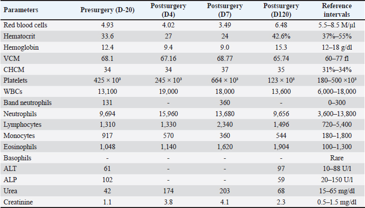Fig. 1. Exploratory laparotomy in a mixed-breed dog showing a large mass measuring approximately 12 cm in the largest tumor diameter in the left abdominal region over the left hepatic lobe or mesenteric site. Blood gas analysis was performed perioperatively from the dorsal metatarsal artery on the left hind limb (arterial) and 10 days after surgery through the jugular venous blood (venous) (Table 2). Arterial blood gas results in metabolic acidosis and respiratory acidosis, categorizing a mixed acid-base disturbance, since the compensatory response for primary metabolic acidosis is respiratory alkalosis. The presence of hypercapnia, defined as a PCO2 greater than 42 mmHg, could suggest hypoventilation/decreased tissue perfusion (lactic acidosis) that was treated by increasing effective alveolar ventilation in addition to supplemental oxygen, with hemodynamic stability optimized to resolve hypercapnia secondary to poor pulmonary perfusion, including whole-blood transfusion. After surgery, the patient was discharged on enrofloxacin (5 mg/kg, twice daily, per os [PO] for seven days), meloxicam (0.1 mg/kg, once daily, PO for five days), tramadol hydrochloride (5 mg/kg, q 8 h, PO for five days), dipyrone (25 mg/kg, q 8 h, PO for five days), and omeprazole (1 mg/kg, twice daily, PO for seven days). One week following unilateral left ureteronephrectomy, azotemia was observed (creatinine 4.1 mg/dl [RI: 0.5–1.5 mg/dl] and urea 203 mg/dl [RI: 15–65 mg/dl]), and treatment with intravenous fluid therapy (Lactated Ringer’s solution) was administered for one week at a maintenance fluid rate of 2 ml/kg/hr. Unfortunately, a complete urinalysis was not performed in the clinic to fully stage the patient for possible chronic kidney disease. Afterward, creatinine decreased to 3.0 mg/dl (RI: 0.5–1.5 mg/dl) and urea to 130 mg/dl (RI: 15–65 mg/dl), and the patient was discharged. In the last parameter (D120) during follow-up, the creatinine level was 2.3 mg/dl (RI: 0.5–1.5 mg/dl), and that of urea was 68 mg/dl (RI: 15–65 mg/dl) (Table 1). The owner did not notice any abnormalities in the patient’s urine at home. The patient was rechecked monthly for hematological and renal abnormalities after being placed on a renal diet. The owner refused adjuvant chemotherapy. The patient was active and had gained weight during the three months of follow-up. Table 2. Canine blood gas parameters in the perioperative and postsurgical analysis*.