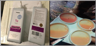 Fig. 2. Photo of Somatest and recording the results of its use. This study was employed using the Whiteside method, where a 4% sodium hydroxide solution was mixed with milk in a ratio of 1:5. With mastitis, a thick viscous mass with flakes is formed. During the settling test, from each share of the udder of cows that showed a positive reaction with the express test, 10–15 ml of milk was poured into test tubes and left in the refrigerator for 16–18 hours. In the milk of cows sick with mastitis, in the process of settling at the bottom of the test tube, sediment appeared, if it is higher than 0.1 cm, then the cows were considered sick with mastitis. According to the results of diagnostic studies using Kenotest, 15 cows with a subclinical form of mastitis were selected, which were divided into 3 groups of 5 animals each. Control group—animals of this group were treated according to the scheme adopted on the farm. Mastometrin was injected subcutaneously at a dose of 5 ml, two times a day, for 2, 4, and 6 days of treatment. Physiotherapy was carried out using the Aquaton device, two times a day with an exposure of 10 minutes (daily), the radiation source was placed at a distance of 15–20 cm from the skin of the affected area of the udder. Massage the udder two times a day by rubbing ichthyol ointment into the affected parts of the udder (Fig. 3). The difference in the treatment of animals in the first experimental group from the control group was the replacement of Mastometrin with a homeopathic preparation developed at the Department of Veterinary Medicine S. Seifullin Kazakh Agrotechnical University, which was administered in doses and according to the Mastometrin scheme, and an increased exposure to microwave radiation for 20 minutes. Animals of the second experimental group, in comparison with the first group, did not undergo physiotherapy using the Aquaton device.