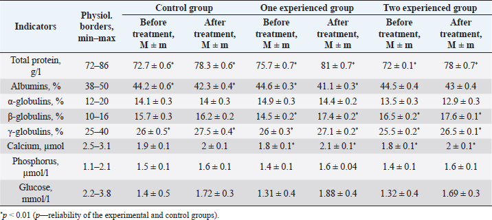 Table 5. Results of biochemical studies of blood serum of cows before and after treatment of subclinical mastitis.