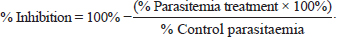 The calculation of parasitemia percentage was made in 1,000 erythrocytes using a light microscope with 1,000× magnification, the growth and the percentage of inhibition were done with the following equation (Inbaneson et al., 2013):