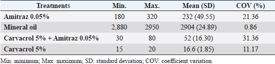 After the death of each mite by contact with the Carvacrol 5%, clarification of the opisthosomas cuticle and mild opisthosomal wrinkling was observed in the group 1 sample (Fig. 1). In group 2, after adding the Carvacrol + Amitraz, a primary agitation of the mites was followed by slowing the movement of the mites between 20 and 40 minutes. The death of the mites occurred between 30 and 80 minutes after application (Table 1). In group 2, clarification of the opisthosomas was observed after the death of each mite by contact with the Carvacrol + Amitraz (Fig. 2).