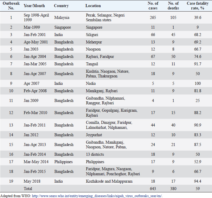 AbstractNipah Virus (NiV) is a highly virulent pathogen that poses a significant threat to human and animal populations. This review provides a comprehensive overview of the latest control and prevention strategies against NiV, focusing on vaccine development, antiviral drug discovery, early diagnosis, surveillance, and high-level biosecurity measures. Advancements in vaccine research, including live-attenuated vaccines, virus-like particles, and mRNA-based vaccines, hold promise for preventing NiV infections. In addition, antiviral drugs, such as remdesivir, ribavirin, and favipiravir, have the potential to inhibit NiV replication. Early diagnosis through molecular and serological assays, immunohistochemistry, and real-time reverse transcription polymerase chain reaction plays a crucial role in timely detection. Surveillance efforts encompassing cluster-based and case-based systems enhance outbreak identification and provide valuable insights into transmission dynamics. Furthermore, the implementation of high-level biosecurity measures in agriculture, livestock practices, and healthcare settings is essential to minimize transmission risks. Collaboration among researchers, public health agencies, and policymakers is pivotal in refining and implementing these strategies to effectively control and prevent NiV outbreaks and safeguard public health on a global scale. Keywords: Antivirals, Control, Nipah virus, Prevention, Vaccines. IntroductionNipah virus (NiV) is a zoonotic paramyxovirus transmitted by bats, which causes lethal encephalitis in humans and has been reported in several countries, including Singapore (Paton et al., 1999), Malaysia (Goh et al., 2000), Bangladesh (Rahman and Chakraborty, 2012), India (Chadha et al., 2006), and the Philippines (Ching et al., 2015). NiV is categorized under the order Mononegavirales, which includes other deadly viruses, such as Hendra, Ebola, and Marburg (Amarasinghe et al., 2019). The first NiV outbreak was identified in 1999 when pig farmers and exporters in Malaysia and Singapore were affected, leading to the collapse of the billion-dollar pig export industry (Doucleff and Greenhalgh, 2017). Initially, control measures focused on the Japanese encephalitis (JE) outbreak, and the spread of NiV could not be detected until the isolation of NiV from the cerebrospinal fluid of a victim after 2 months (Looi and Chua, 2007). The virus was named after the village of Kampung Sungai Nipah, where it was first discovered (Kulkarni et al., 2013). Subsequent NiV outbreaks occurred in India and Bangladesh in 2001 and 2007 (Mahedi et al., 2023), and eight outbreaks from 2001 to 2012 (Ambat et al., 2019). The most recent outbreak was reported in Kozhikode district, Kerala, India, on May 19, 2018 (Table 1) (Thomas et al., 2019). NiV and Hendra virus (HeV) are closely related and share 80% genome sequence identity (Ang et al., 2018). These viruses have been categorized within the genus Henipavirus, alongside the Cedar virus (Marsh et al., 2012), Ghanaian bat virus (Drexler et al., 2009), and Mojiang virus (Wu et al., 2014). Fruit bats of the genus Pteropus have been identified as natural reservoirs for NiV. This pathogen poses a significant threat to both humans and animals, including pigs (Orosco, 2023), with human-to-human and animal-to-human transmission occurring via infected bats and pigs (Thomas et al., 2019). Notably, NiV has an alarming case fatality rate of up to 100% (Table 1). Owing to its high fatality rate and the absence of effective therapeutics or vaccines, the World Health Organization has designated NiV as a biosafety level 4 (BSL4) pathogen (Freiberg et al., 2010). Consequently, urgent measures are required to effectively prevent and control NiV infection and safeguard vulnerable populations. In light of the persistent threat posed by NiV to human and animal health, this review paper seeks to comprehensively address the multifaceted challenge of developing effective control and prevention strategies. The paper aims to explore the current state of knowledge in areas including vaccine development, antiviral drug discovery, early diagnosis, surveillance, and high-level biosecurity measures. By delving into these interconnected aspects, this review endeavors to offer a synthesized understanding of the current landscape and prospects in combatting NiV infections. Table 1. Case fatality rates of NiV infection in humans.