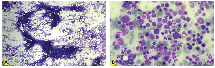 Fig. 5. Myelogram, Golden Retriever, T-zone lymphoma. (A) Bone marrow particle. In this sample, the cell:fat ratio was estimated at 60%. 4× objective. (B) In the region around the particles, a concentration of 22.8% of typical small lymphocytes was observed. 40× objective. Diff-Quik staining. In peripheral blood immunophenotyping, the lymphocyte gate, which represented 80.9% of the nucleated cellularity, resulted in a CD5+phenotype in almost 100% of cells (Fig. 6.1). However, only 2.5% and 2.2% of these cells were CD4+ and CD8+, respectively. In addition to this atypia, 69.7% of cells were CD45-. Similar results were observed in lymph nodes and bone marrow immunophenotyping (Fig. 6.2 and 6.3). These results are summarized in Table 1. Based on the cytological and immunophenotypic characteristics, a diagnosis of TZL was confirmed, and conservative treatment was instituted with 2 mg of chlorambucil (4 mg/m² EOD, continuous use) and 20 mg of prednisolone (1 mg/kg SID for 7 days, then 0.5 mg/kg SID for 14 days, followed by 0.5 mg/kg SID every 48 hours for another 30 days). After diagnosis and treatment initiation, the dog returned for evaluation, and monitoring blood tests were performed (Table 2). In the first month of treatment, the animal presented with moderate anemia, with hematocrit values ranging from 26% to 27% in three tests. A single dose of oral lomustine was administered, at 60 mg/m2 in the second week but despite no adverse events, there was no improvement in the hematological parameters. The dog remained asymptomatic during the entire treatment and follow-up. Anemia became mild in the second month of treatment (hematocrit 35%), reaching normocytosis in the fourth month, with hematocrit 40%. Thereafter, the hematocrit oscillated near the lower limit of the reference range, being within the reference range in the last blood test (hematocrit 44%), performed after 15 months of follow-up. The anemia in the first and second months of treatment was accompanied by extreme leukocytosis of over 200,000 cells/µl, constituted by 88% to 99% lymphocytes with the same characteristics as the first blood test. In the fourth month of treatment, the erythroid normocytosis was accompanied by a decrease in leukocyte count to 89,000 cells/µl, still with 91% of lymphocytes. From the fifth month, leukocytosis became moderate and decreased until it reached a count of leukocytes within reference values (14,400 cells/µl) (Fig. 7A and B). In this test, lymphocytes represented 75% of leukocytes, with morphology similar to the first test. Pearson correlation test showed a strong negative correlation between hematocrit and leukocyte count (p=0.0009; rP=−0.851), and hematocrit and lymphocyte count (p=0.001; rP=−0.836).