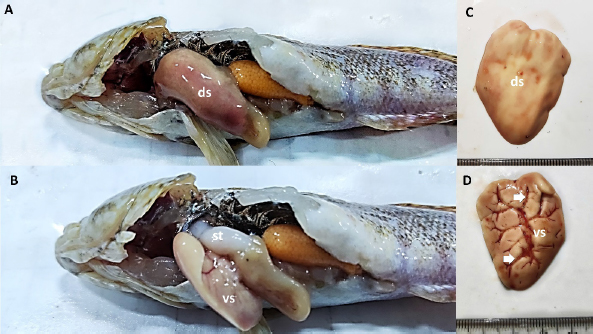 Fig. 1. (A, B) liver of G. paganellus lies cranially ventral to the stomach (st), on the left side in the general cavity, in a pale reddishbrown color. (C, D) Pyriform-shaped, one lobe with a smooth concave dorsal surface (ds) and a convex ventral surface (vs) with shallow fissure (arrowed) surrounding the large blood vessels. The liver is wide from the cranial region and, narrow from the tail and covered with a thin layer of serous membrane.