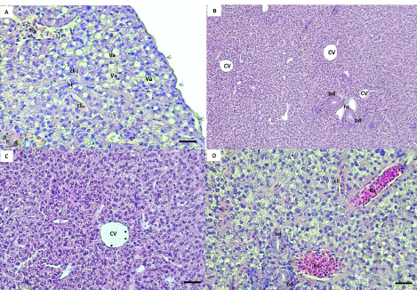 Fig. 2. (A, B, C, D) Histological sections of the liver show the hepatic tissue (ht) with discrete hepatocyte, central vein (cv), hepatic sinusoids (hs). A and C a thin layer of simple squamous epithelium with lamina propria encapsulated the liver parenchyma (black arrow). The presence of vacuolated hepatocyte (va). hs and cv lined with endothelial cells (black and white arrow), respectively. B and D bile ducts (bd) lined with simple cuboidal. The canaliculi (cli) between the hepatocytes. (Bar: B: 0.001 mm; A, C, D: 0.0005 mm). The blood sinusoidal is lined with simple squamous epithelial tissue (elongated endothelial cells with flattened nuclei) and discontinuous basement membrane forming a very thin epithelial sheet (Fig. 2D). No portal triads as in higher vertebrates or lobule division; instead, it has a structure of sinusoids that converge at the central vein (Fig. 2B). The biliary system consists of ducts and bile canaliculi (Fig. 2B and D). The bile ducts and portal vein are located surrounded mainly by the parenchyma of the liver tissue. The bile duct is lined by simple columnar epithelium and structurally consists of three distinct layers: tunica mucosa of epithelial cells that are simple cuboidal with large spherical nucleus and brush border, tunica muscularis of some smooth muscles, and very thin tunica serosa of dense connective tissues. The apical border of the adjacent hepatocytes faces toward the bile canaliculi direction, where the bile ducts exist (Fig. 2D).