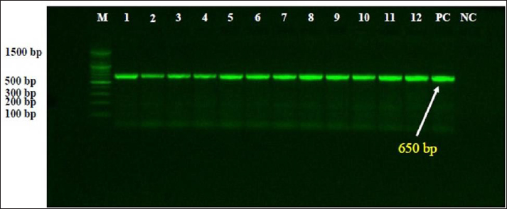 Fig. 1. Representative image for electrophoresis of PCR products in 1.5% agarose gel to detect amplified DNAs of Spirochetes targeting 16S rRNA gene. While, Lane M: Ladder marker (100–1,500 bp); Lane PC: Positive control, Lane NC: Negative control, Lanes 1–12: Positive samples of Spirochetes at 650 bp.