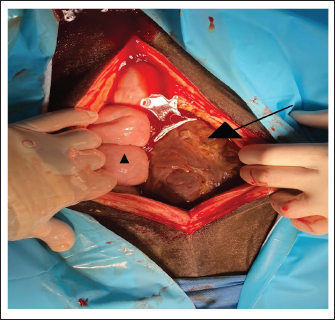 Fig. 3. Surgical view following ventral midline laparotomy with the horse in dorsal recumbency. Cranial is at the bottom of the image. The GCT is seen against the abdominal wall (arrow). A small segment of the small intestine was visible (triangle). The dimension of the tumor did not allow any exteriorization from the large or small intestine and any manipulation was possible. The mare was discharged with recommendations for an additional 5 weeks of stall confinement with only shorthand walks (5 minute daily, increasing by 5 minute each week). Follow-up information was obtained by e-mail 3 months after the surgery and showed that the mare was doing well and being ridden again. During the follow-up period, the mare did not show any abdominal discomfort, colic signs, or stallion-like behavior. The serum concentration of the ani-Muellerian hormone was not determined after the surgery.