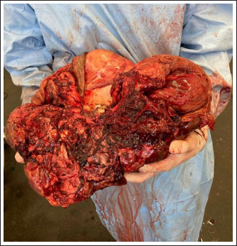 Fig. 5. The GCT was removed after a partial intra-abdominal resection. Part of the tumor that had been resected intra-abdominally is missing. The triangle indicates where the resection was performed. Due to the high blood supply to the tumor, bleeding is inevitable during intra-abdominal resection. The time between partial resection and sealing of the ovarian pedicle must be minimized to stop bleeding as soon as possible. DiscussionThe most commonly described causes of hemoperitoneum in horses include neoplasia (approximately 13% of cases), idiopathic hemorrhage (22%), uterine injury (22%), blood vessel rupture (20%), and splenic lesions (19%) (Sherlock et al., 2016). Trauma is thought to explain as many as 9% of cases (Worsman et al., 2018), while hemoperitoneum due to ovarian hematoma or GCT is less common. GCT was reported to cause hemoperitoneum as a result of rupture before or during surgery (Alexander et al., 2004; Harper et al., 2010; Sherlock et al., 2016; Worsman et al., 2018), and spontaneous rupture may occur due to rapid growth of the tumor (Worsman et al., 2018). In reported cases of hemoperitoneum caused by GCT, hemorrhage was severe and sometimes life-threatening due to systemic cardiovascular compromise. The treatment of choice for GCT is surgical removal (Alexander et al., 2004; Crabtree, 2011; Sherlock et al., 2016) and several surgical approaches for ovariectomy have been described. These include midline, flank, and paramedian laparotomy, colpotomy, and bilateral or unilateral laparoscopic approaches in the standing sedated horse (Smith and Mair, 2008; Gee et al., 2012; Ragle, 2012; Daniel et al., 2015; Colbath et al., 2017; Sinovich et al., 2022). Conservative treatment in some cases was followed by surgical removal at a later stage (Alexander et al., 2004) once medical stabilization was achieved. In the case reported here, the duration of tumor growth before clinical presentation was unknown; however, the clinical appearance at the time of first admission would support Worsman et al.'s (2018) theory that spontaneous rupture may occur due to rapid tumor growth. Usually, these tumors are due to increased excretion of specific reproductive hormones by the tumor, such as testosterone and inhibin, and in this particular case, the young age of the mare should also be considered. In fact, GCT can be found in mares of any age, but the average age of affected mares is 11 years. Juvenile GCTs are very rare and have presented often with hemoperitoneum in weanlings in other studies (Green et al., 1988; McKinnon and Barker, 2010). Why GCTs in young horses tend to grow so fast and produce hemorrhages is not entirely clear, but could be related to the stage of hormonal development in which weanlings are involved. It would be interesting to compare the levels of the different hormones at a young age to better understand the progression of the disease. The size of the GCT did not allow for a standing ovariectomy, which is routinely performed laparoscopically or hand-assisted (Ragle, 2012; Daniel et al., 2015). The two-step surgery and the use of a motorized morcellator were considered. The two-step surgery comprises the first step of detaching the ovarian pedicle in a standing laparoscopy, followed by removal by laparotomy in a second step. This method was not used here because it was expected that the size of the tumor would preclude sufficient visibility after insertion of the optic into the abdomen and that it would not be possible to move the GCT sufficiently using laparoscopic instruments to visualize the ovarian pedicle. The use of a motorized morcellator is described as a method of ovariectomy with good results (Lund et al., 2014); however, all of the treated mares underwent bilateral ovariectomy and none showed ovarian neoplasia (Lund et al., 2014). In addition, the dimensions of the ovaries of the treated mares were considered physiologic (Lund et al., 2014). Based on these assessments, it was decided to perform the ovariectomy under general anesthesia through a ventral midline incision. General anesthesia is always considered a high-risk option in critically ill horses; however, the mare appeared sufficiently stable based on clinical and hematological examination. Furthermore, diagnostic laparotomy allowed the exclusion of adhesions between the GCT and other organs by providing better visualization and evaluation of the ovarian pedicle (Conwell et al., 2010; Harper et al., 2010; Finding et al., 2011; Worsman et al., 2018). For safety reasons, a GCT should generally not be cut, but in this specific case, it was the only option. One of the main disadvantages of the described technique is that the GCT was dissected blindly in the abdomen. This is a high-risk technique because the bowel or other organs could be damaged. To avoid injury to the intestine or other organs, it was important to cut the GCT under manual control, staying in the middle of the tumor, and limiting transection to parts of the tumor that could be reached manually to protect the tenotomy knife. In addition, once the tumor was partially resected, bleeding was inevitable since the ovarian artery was still connected to the GCT. In fact, one of the main complications of this technique was the intra-operative hemorrhage following partial ovariectomy. Therefore, thetime between partial ovariectomy and sealing of the ovarian pedicle had to be minimized to prevent hypovolemic shock. The ligation of the ovarian pedicle is usually the first step in ovariectomy, but in this case, it was not possible because the pedicle lay under the GCT and could not be reached and ligated until partial resection of the tumor had been performed. All necessary instruments were ready to stop the bleeding once the ovarian pedicle could be reached, and preparations had been made for an immediate blood transfusion in case of massive bleeding. An additional limitation of the approach described here is the possibility of metastasis due to int