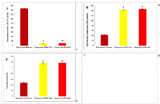 Fig. 1. Analysis of pomegranate by HPLC. (A) Antioxidant activity ( R C 50, μg/ml). (B) Total phenolic content (mg GAE/g extract). (C) Total flavonoid (%). Results are expressed as mean ± SEM (n=3 for all groups). $ p < 0.05 when compared to the corresponding PM values, # p < 0.05 when compared to pomegranate white peel values using one-way ANOVA followed by Tukey’s post-hoc test.