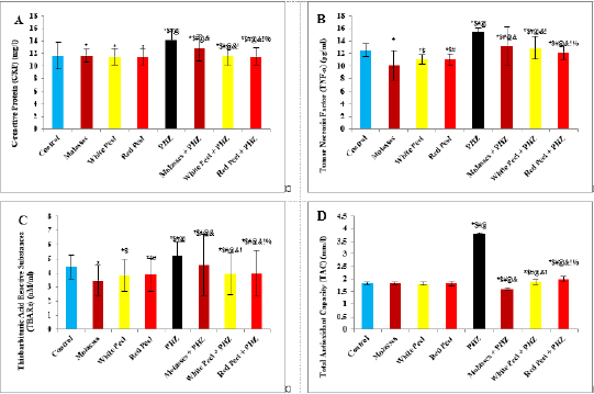 Fig. 4. Effect of oral administration of molasses extract, white peel pomegranate extract, and red peel pomegranate extract to control or PHZ rats both at 25 mg/kg/day for 2 weeks on (A) CRP (mg/l). (B) Tumor necrosis factor (TNF-a) (pg/ml). (C) Thiobarbituric acid reactive substances (TBARs) (nM/ml). (D) TAC (mm/l). Results are expressed as mean ± SEM (n=8 for all groups). * p < 0.05 when compared to the corresponding control values, $ p < 0.05 when compared to the corresponding molasses values, # p < 0.05 when compared to white peel values, [at] p < 0.05 when compared to red peel values, & p < 0.05 when compared to PHZ values! p < 0.05 when compared to molasses+PHZ values, %p < 0.05 when compared to white peel+PHZ values; using one-way ANOVA followed by Tukey’s post-hoc test. Flavonoids, polyphenols, pectin, and ascorbic acid form 1.5% of the weight of pomegranate juice (PJ). The soluble polyphenol content is between 0.2% and 1% depending on variety, and includes mainly anthocyanins (Ignarro et al., 2006; Darwish et al., 2009). The total content of anthocyanins was found to be higher in pomegranate than in any other fruit juice tested for antioxidant activity. Anthocyanins are glycosides of anthocyanidin and are the most abundant water-soluble plant pigments responsible for the red, blue and purple colors of fruits. They are potent antioxidants, and their activity is directly related to their unique chemical structures (Rice-Evans et al., 1996). Concerning oxidative stress biomarkers, both MDA (secondary product of lipid peroxidation) and LDH showed a significant increase in the PHZ group as compared with the control group, while in pomegranate-treated and PHZ co-treated groups with pomegranate, they showed a significant decrease. Similarly, it was reported that PJ caused a significant decrease in MDA in the kidney cortex of rats under oxidative stress. In addition, the pomegranate methanol extract from the peel caused a significant decrease in MDA levels in kidney samples of rats (Fatma, 2014). Furthermore, previous studies demonstrated that PHZ treatment of rats was associated with a marked elevation in serum MDA as well as a significant reduction in the level of TAC. Feeding rats with 5% dried green beet reduced serum MDA levels as well as improving the level of TAC (Elaby and Ali, 2018). In this study, the enzymatic activities of SOD and CAT, as well as GPx levels, showed a significant decrease in the PHZ group as compared with the control group. On the other hand, PHZ co-treated groups with pomegranate showed a significant increase in CAT, GPx, and SOD levels, where PM, pomegranate white peel and pomegranate red peel analysis showed considerable antioxidant activity due to their high phenolic, and flavonoid contents. Polyphenols are considered the major class of phytochemicals in pomegranate fruit. They have an antioxidant activity in vivo and in vitro. The antioxidant activities of dietary polyphenols include reactive species scavenging, enzyme modulation to interfere with cell signaling and oxidative stability. In addition, pomegranate is a major source of soluble polyphenols such as gallic acid, ellagic acid, punicalagin, and quercetin. Furthermore, it was demonstrated that polyphenols possess powerful antioxidant properties, which represent the mechanism most likely responsible for the protective benefits of pomegranate. The antioxidant capacity of pomegranate is shown to be three times higher than that of red wine or green tea infusion. In addition, pomegranate is rich in polyphenolic class antioxidants, including flavonoids such as gallotannins, ellagitannins, ellagic, ferulic, and gallagic acids, anthocyanins, quercetins, and catechins. The polyphenols show important biological activities, including oxidation inhibition, free radical elimination, and reduction of the risks of cardiovascular diseases. Ellagitannins may be responsible for the anti-mutagenic and antioxidant activities of pomegranate (Doostan et al., 2017).