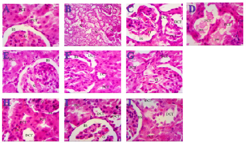 Fig. 5. Photomicrographs (H&E) of kidney sections of (A) Control (×1000) showing normal structure with no histopathological changes, normal G and PCTs, Bowmen’s capsule with ordinary regular urinary Bowman space (BS). (B) PHZ (1 mg) (×400) illustrating disorganization and spread of necrosis (N) throughout the renal parenchyma with severely damaged glomeruli (G). (C) PHZ (1 mg) (×1000) illustrating damaged and lobulated G with intra-glomerular hemorrhage (H) and widened Bowman’s space (BS), damaged and necrotic proximal and distal convoluted tubules (PCT and DCT, respectively). (D) PHZ (1 mg) (×1000) showing highly destructed proximal and distal convoluted tubules (PCT and DCT, respectively) with hyaline proteinaceous material. (E) Red peel pomegranate-administered rat (×1000) showing nearly normal renal parenchyma containing G and PCTs with good profile and regular Bowman’s space (BS) except some sort of thickening in the parietal layer of Bowman’s capsule. (F) White peel pomegranate-administered rat (×1000) showing renal elements G, PCT, DCT, and BS with good histological appearance except some sort of lobulation in the G. (G) Molasses pomegranate-administered rat (×1000) showing renal elements; G, PCT, DCT, and BS with good histological appearance except some sort of vacuolization in the G, which contains the characteristic red pigment. (H) Red peel pomegranate (Red Peel + PHZ) (×1000) showing good renal parenchyma; G, PCT, and DCT but the G still containing sclerosis (Sc) together with damaged (D) renal nuclei. (I) White peel pomegranate (White Peel + PHZ) (×1000) showing a low level of repair in the renal elements where the G is still lobulated with widened Bowman’s space, PCT and DCT are still vacuolated and damaged. (J) Molasses pomegranate (Molasses + PHZ) (×1000) showing a nearly normal G, BS, and PCT, but the DCT is still damaged. Pomegranate (P. granatum L.) was found to be high in natural antioxidants (anthocyanins, catechins, quercetin, gallotannins, ellagitannins, ellagic, ferulic, and gallic acid). Ellagitannins (punicalagin and its derivatives) were found out to be the most abundant polyphenols in the peel, and they are responsible for the peel’s potent antioxidant properties (El-Wakf et al., 2018). However, pomegranate’s most potent antioxidant activity is due to its inclusion of several phenolic components (ellagic acid, punicalin, and punicalagin) instead of single pure polyphenols (Doostan et al., 2017). Our results revealed a marked reduction in renal function, as characterized by significant increases in creatinine, uric acid, and BUN levels in the PHZ group as compared with the control group. On the other hand, pomegranate-treated and PHZ co-treated groups with pomegranate showed a significant decrease in creatinine, uric acid, and BUN levels. In the same respect, serum creatinine and urea levels increased significantly in the PHZ group, and feeding 5% dried beet green significantly decreased the levels of serum urea and creatinine. Renal dysfunction and structural damage have been attenuated using beetroot through the reduction of oxidative stress, inflammation, and apoptosis in the kidney (Elaby and Ali, 2018). In addition, the rats that received meatballs containing PM or peel and molasses mix exhibited a significant decline in BUN level compared with the control group. Moreover, prophylaxis with pomegranate peel extract for a week resulted in reducing serum creatinine and urea values in oxidative damage induced by Ferric nitrilotriaacetate (Fe-NTA) in rats. In addition, the administration of PJ and pomegranate peel methanol extract in rats with chronic renal failure significantly decreased serum levels of creatinine, BUN, and uric acid (Fatma, 2014). PM reduced the levels of urea, uric acid, and creatinine. However, ciplastin elevated the levels of kidney functions (Abdel Moneim et al., 2011). Regarding CRP, tumor necrosis factor, TBARSs, and TAC, our results are in agreement with (Fatma, 2014; Elaby and Ali, 2018). It was reported that pomegranate peel methanol extracts lowered thiobarbituric acid reactive substance (TBAR) and significantly decreased serum tumor necrosis factor-α (TNF-α) and CRP accompanied by an increase in NO level. PJ was found to have inhibitory effects on renal tubular cell injury and oxidative stress (Fatma, 2014). Our finding is supported by the study of Cekmen et al. (2013), who concluded that PE has an overall protective effect against GEN-induced nephrotoxicity in rat models. The observed protective effects can be attributed to the antioxidant properties of PE. However, pomegranate is a highly free-radical scavenger agent and offers protection against GEN-induced acute renal failure. Similarly, treatment with PJ) before, during, and after diethylnitrosamine (DEN) and Carbon tetrachloride (CCl4) administration showed a reduction in the levels of kidney caspase-3, DNA fragmentation (DNAF), NO as well as creatinine, urea, and uric acid levels compared with the DEN group. This means that polyphenolic compounds in pomegranate play an important role in quenching the free radicals resulting from the metabolism of DEN, thereby inhibiting lipid peroxidation and protecting membrane lipids from oxidative damage and, in turn, preventing apoptosis (Hamouda et al., 2015). Concerning the histopathological changes, it could be suggested that excessive production of reactive oxygen species (ROS) and lipid peroxidation (LPO) play a key role in renal damage induced by phenylhydrazin, and these protective effects of pomegranate could be due to the presence of a variety of biologically active compounds. Antioxidant and free radicals scavenging properties of pomegranate might be partially responsible for its nephroprotective activity. ConclusionThe present results suggest that pomegranate can be an effective agent against the toxic effects of phenylhydrazin both at the biochemical and histological levels and show beneficial effect