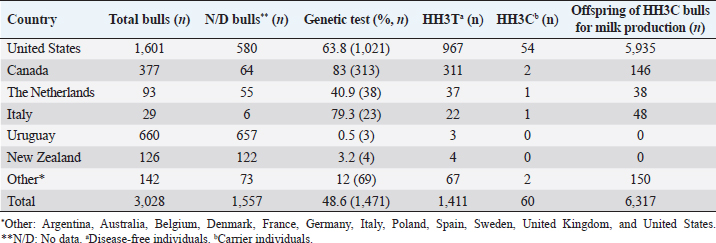Table 2. Genetic status for the HH3 haplotype of bulls used as sires in Uruguayan dairy genetic evaluation systems until 2021 according to country of origin.