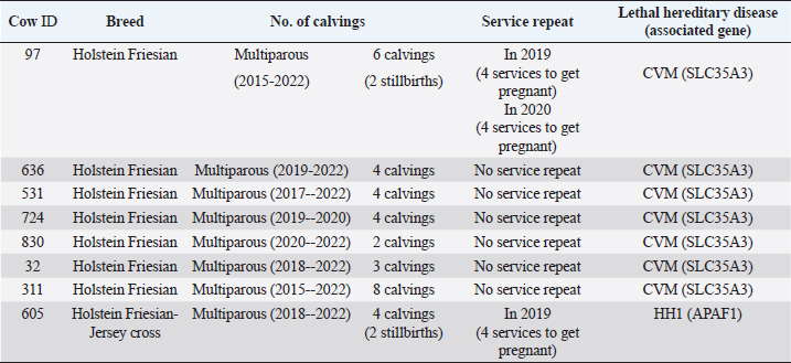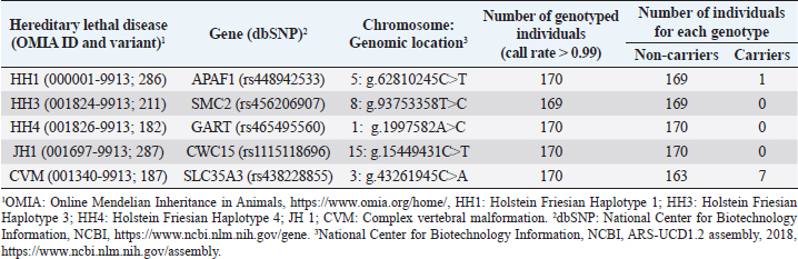 AbstractBackground: Most dairy cattle breeds originate show an average generational inbreeding rate of 1%, which favors the occurrence of recessive defects associated with low reproductive performance. Aim: The objective of this study was to monitor recessive defects associated with low reproductive performance in dairy cattle. Methods: To monitor bulls carrying the Holstein Friesian haplotype (HH) 1, HH3, and HH4 haplotypes, we analyzed the records of 3,028 national and imported Holstein Friesian bulls from the 2021 updated sires’ catalog published by “Evaluaciones Genéticas Lecheras”; and to determine the presence of these mentioned haplotypes, as well as Jersey haplotype (JH) 1 and complex vertebral malformation (CVM), were genotype with the GeneTitan® 2,500 single nucleotide polymorphism (SNP) bovine chip, estimate their frequencies and evaluate their impact on the fertility of 100 Holstein Friesian cows and 70 Holstein Friesian-Jersey crosses belonging to an experimental dairy. Results: From a total of 1,468 (48.5%) bulls with genetic information from the sires’ catalog for HH1 and 1,471 (48.6%) for HH3 and HH4, we found 90 (6.1%) carriers for HH1, 60 (4.1%) for HH3, and 6 (0.4%) for HH4, respectively. By genotyping with the chip, we calculated the herd frequency of the mutant alleles and herd prevalence of carriers for HH1 and CVM as q=0.003 and 0.022; 0.59% and 4.3% (call rate >0.99), respectively. No mutant alleles were found for HH3, HH4, and JH1 in the analyzed population. We examined reproductive data by observing the presence of CVM and HH1 mutant alleles in repeat cows with an average of four services to achieve pregnancy. Conclusion: This study demonstrated the presence of recessive defects associated with low reproductive performance in the analyzed population, which can affect the health and productivity of dairy cattle. Therefore, cows and bulls should be closely monitored through genetic testing to lower the incidence of recessive defects in dairy cattle. Keywords: Artificial insemination, Bos taurus, Fertility, Hereditary diseases. IntroductionMost dairy cattle breeds originate from a small number of founder animals through artificial insemination with a strong selection for a few productive traits (Fritz et al., 2013; Liebig et al., 2022). Consequently, these breeds show an average generational inbreeding rate of 1% that favors the appearance of recessive defects responsible for embryonic, fetal, and perinatal mortality because it increases homozygosity levels (Van Raden et al., 2011b; Fritz et al., 2013). The implementation of routine genotyping of hundreds and thousands of animals within popular US dairy breeds using single nucleotide polymorphism (SNP) chips has provided comprehensive genomic data for all current breeding populations (Van Raden et al., 2011b; Howard et al., 2017). Van Raden et al. (2011b) were the first to propose examining this type of data to identify genomic regions in homozygosity-deficient animals. In their work, they identified and listed five haplotypes out of 11 candidates with detrimental effects on fetal development, which could lead to abortion and fetal death in three dairy cattle breeds: Holstein Friesian (HH1, HH3, and HH4), Jersey (JH1), and Brown Swiss (BH1). After two years, other new lethal haplotypes were reported in Holstein Friesian cattle, and in the meantime, some were solved at the molecular level, such as HH1 ( APAF1, Adams et al., 2016), HH3 ( SMC2, Daetwyler et al., 2014; McClure et al., 2014), HH4 ( GART, Fritz et al., 2013) and HH5 ( TFB1M, Schütz et al., 2016). In the Danish Holstein population, a haplotype associated with a missense variant in the SLC35A3 gene that causes complex vertebral malformation (CVM) was identified (Thomsen et al., 2006). It was demonstrated that, in the homozygous state, the mutation typically results in intrauterine death. Sonstegard et al. (2013) identified the mutation in the CWC15 gene that is associated with the JH1 haplotype and negatively impacts reproduction in Jersey cattle. Recently, Häfliger et al. (2022) updated the SNP positions from the new Bos taurus genome version ARS-UCD1.2 (NCBI, ARS-UCD1.2 assembly, 2018; Rosen et al., 2020) in the genomic regions of the haplotypes previously identified by other authors (Thomsen et al., 2006; Sonstegard et al., 2013; Daetwyler et al., 2014; McClure et al., 2014; Adams et al., 2016). For all bovine breeds, 54 haplotypes with homozygous deficits have been reported; in 25 of them, the mutations associated with the responsible genes have been identified (OMIA, 2011). In the Holstein Friesian breed, 11 haplotypes have been identified; these mutations reduce the pregnancy rate and produce an increase in stillbirths and spontaneous abortion that aggravate the already critical situation of fertility loss (Van Raden et al., 2011b; Fritz et al., 2013; McClure et al., 2014; Adams et al., 2016; Schütz et al., 2016; Fritz et al., 2018; Hozé et al., 2020; Häfliger et al., 2022). Given the economic importance of producing offspring for the selection of breeders and generating genetic influence of the resulting cows, the main objectives of this study were: (a) to monitor bulls with genetic information for the haplotypes HH1, HH3, and HH4, which are associated with low reproductive efficiency by analyzing the 2021 Holstein Friesian sires’ catalog; and (b) to determine the presence of the mutant alleles of these haplotypes, as well as JH1 and CVM, with the GeneTitan® 2,500 SNP bovine chip of Affymetrix platform. We calculated their frequencies and evaluated their impact on fertility in Holstein Friesian cows and Holstein Friesian-Jersey crosses from a dairy farm of the experimental field of the Veterinary Faculty of the “Universidad de la República” (Libertad, San José, Uruguay). Materials and MethodsAnalysis of the 2021 Holstein Friesian sires’ catalogWe analyzed the records of 3,028 national and imported Holstein Friesian bulls, b
