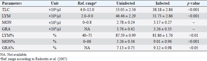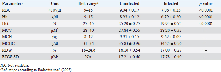 Table 2. Means (±standard error) of RBC, Hb, Hct., MCV, MCH, MCHC, RDW, and RDW-SD in B. ovis-infected Lohi sheep compared to uninfected.