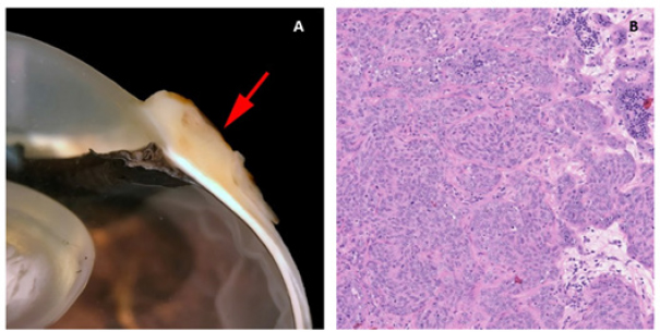 Fig. 6. (A) Case 4 gross pathology photomicrograph of a solid, poorly differentiated angiosarcoma, note the cream-coloured cut surface. (B) Histopathology photomicrograph, case 4, note the highly cellular and solid presentation with a lack of vasculature and red blood cells.