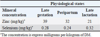 Table 2. Whole blood selenium concentration and serum blood zinc concentration of female alpacas during three physiological states and their offspring.