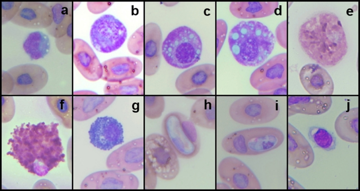 Fig. 1. Photographs taken from blood smears of selected Central America bushmaster (L. stenophrys) under human care in Costa Rica. Wright stains at 100×. (a) Lymphocytes; (b–d) azurophils; (e) heterophil; (f) eosinophil; (g) basophil; (h and i) hemoparasites; and (j) thrombocyte. Table 2. Biochemical values (n=32) of the Central America bushmaster (L. stenophrys) under human care in Costa Rica.